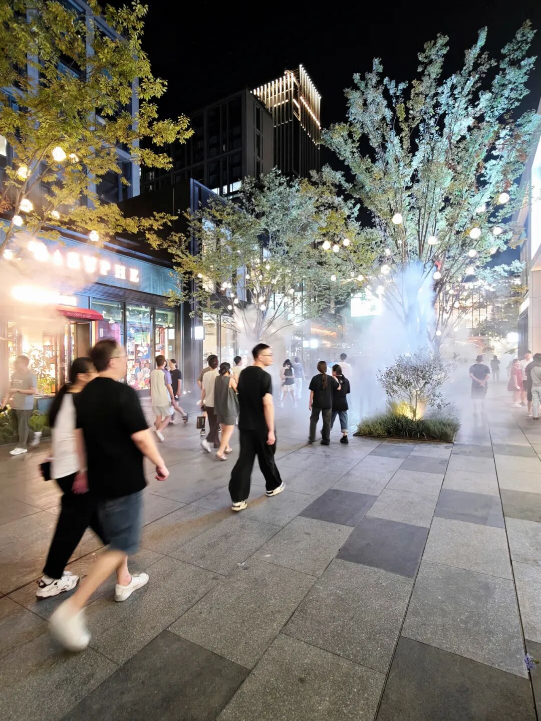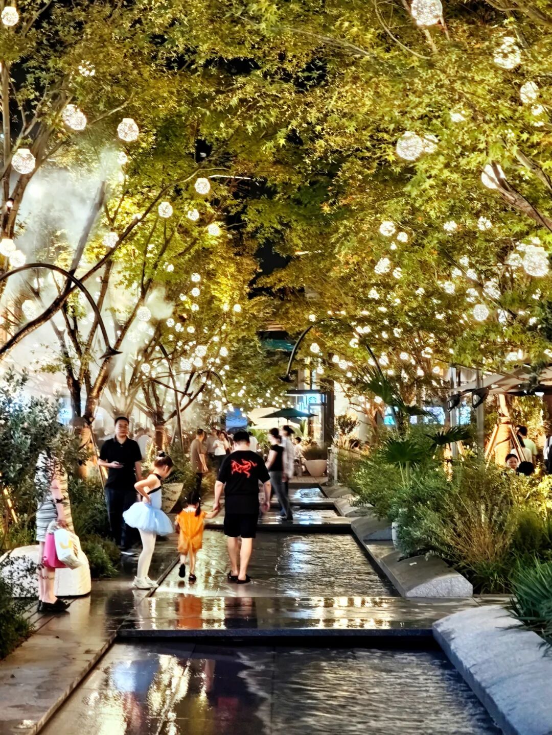 戶外街區(qū),亞奧萬象天地的里巷,擴(kuò)大了步道寬度以更適合人們游逛,綠植及水景更為豐富且層次多樣,并增加了休息區(qū)等人性化設(shè)施,指引標(biāo)識(shí)還進(jìn)行了主題化設(shè)計(jì),覆蓋整個(gè)街區(qū)的噴霧降溫裝置也能有效抵御夏日高溫。