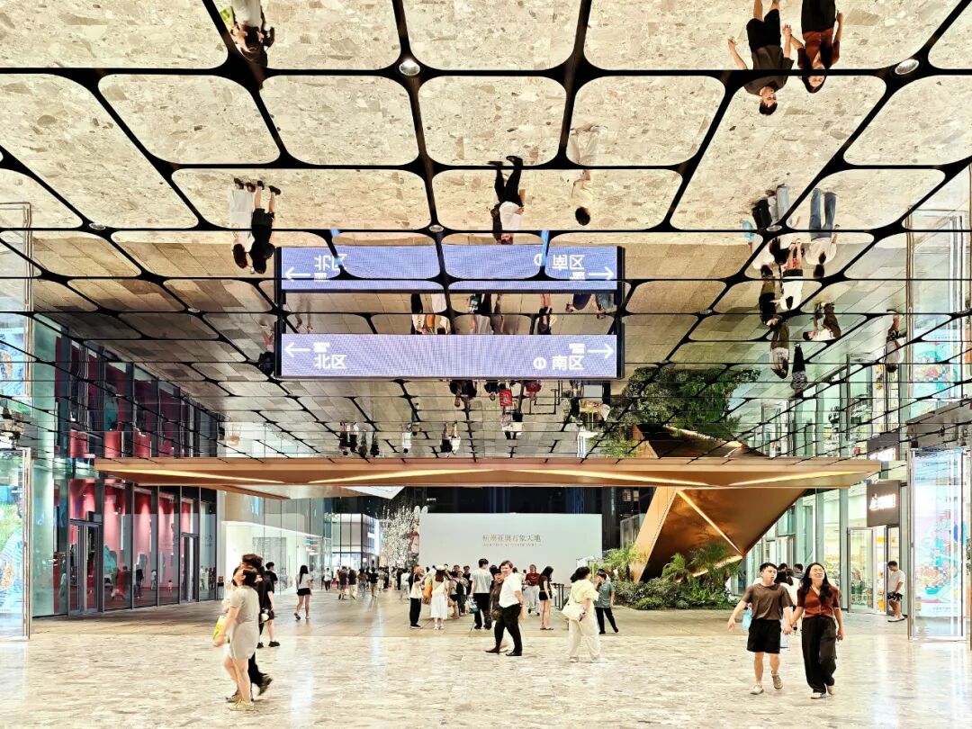 空間設(shè)計(jì),為呼應(yīng)密路網(wǎng)規(guī)劃,及形成從街區(qū)延伸至錢塘江的「風(fēng)路通道&視覺通廊」,室內(nèi)商場被規(guī)劃為從L1分隔開的南區(qū)與北區(qū),地面通道作為過道空間,并以頂部的鏡面設(shè)計(jì)弱化空間壓抑感,構(gòu)建出兼具功能與顏值的打卡區(qū)。