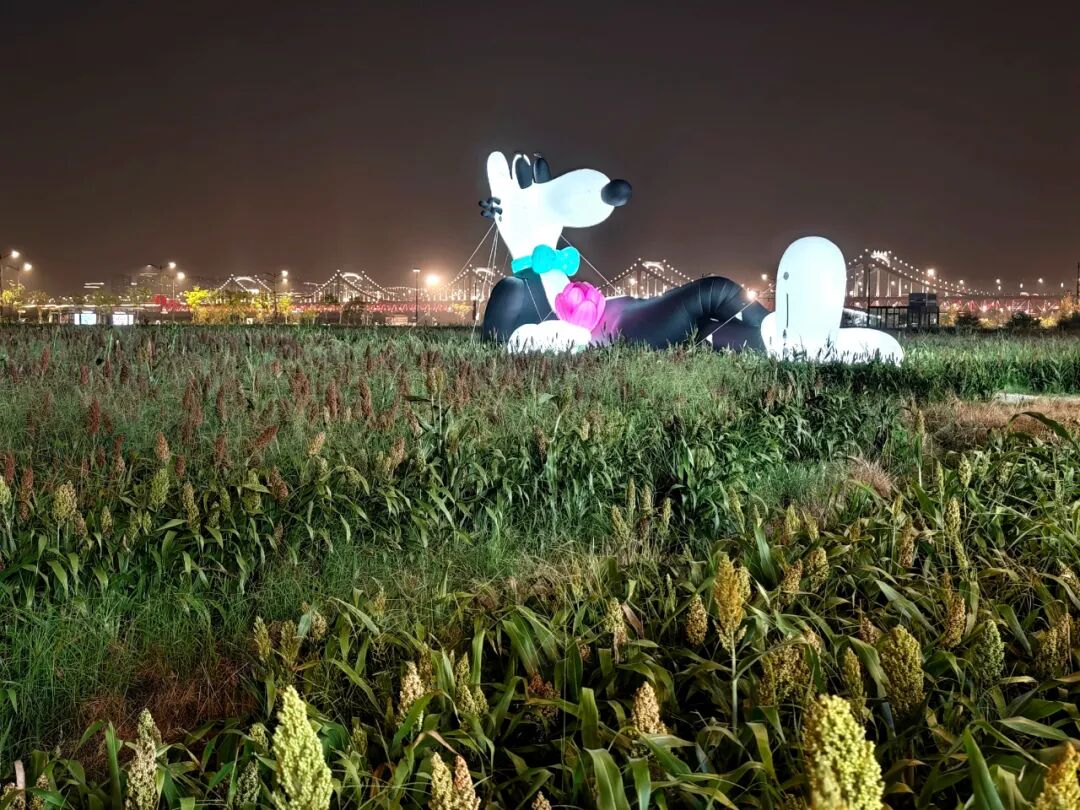 項(xiàng)目往北被彭埠大橋所阻,往東則是「錢江世紀(jì)公園&之江綠道」,相互之間近在咫尺卻被大片無道路連通的農(nóng)田「物理分割」;而本次藝術(shù)展中的Mello形象,也只能孤零零坐于旁人無法靠近的農(nóng)田中。