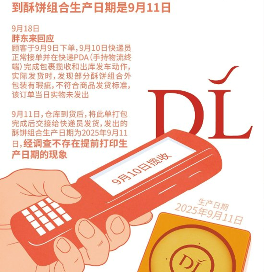 對(duì)此胖東來立即組織調(diào)查,其實(shí)是快遞攬收后發(fā)現(xiàn)包裝有問題,更換后重新發(fā)貨而日期未更改導(dǎo)致。胖東來給出的處理結(jié)果是,經(jīng)調(diào)查酥餅組合不存在提前打印生產(chǎn)日期的情況,因快遞員未按標(biāo)準(zhǔn)發(fā)貨流程執(zhí)行,導(dǎo)致快遞系統(tǒng)軌跡與實(shí)際發(fā)貨軌跡不同步,讓顧客造成誤解,為顧客辦理一套酥餅組合的退款,并在網(wǎng)上公布了調(diào)查結(jié)果。