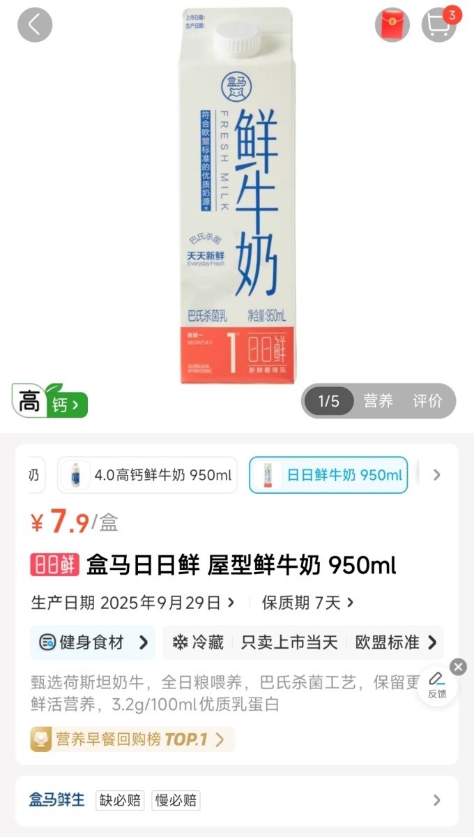 如果你在盒馬鮮生APP上購(gòu)買鮮牛奶,看到的是這樣的: