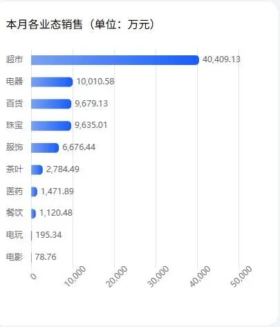 從本月各業(yè)態(tài)銷售表現(xiàn)來看,超市依然是主力選手,其銷售額約4.04億元;電器約1億元,百貨約9679萬元,珠寶約9635萬元,表現(xiàn)同樣亮眼。