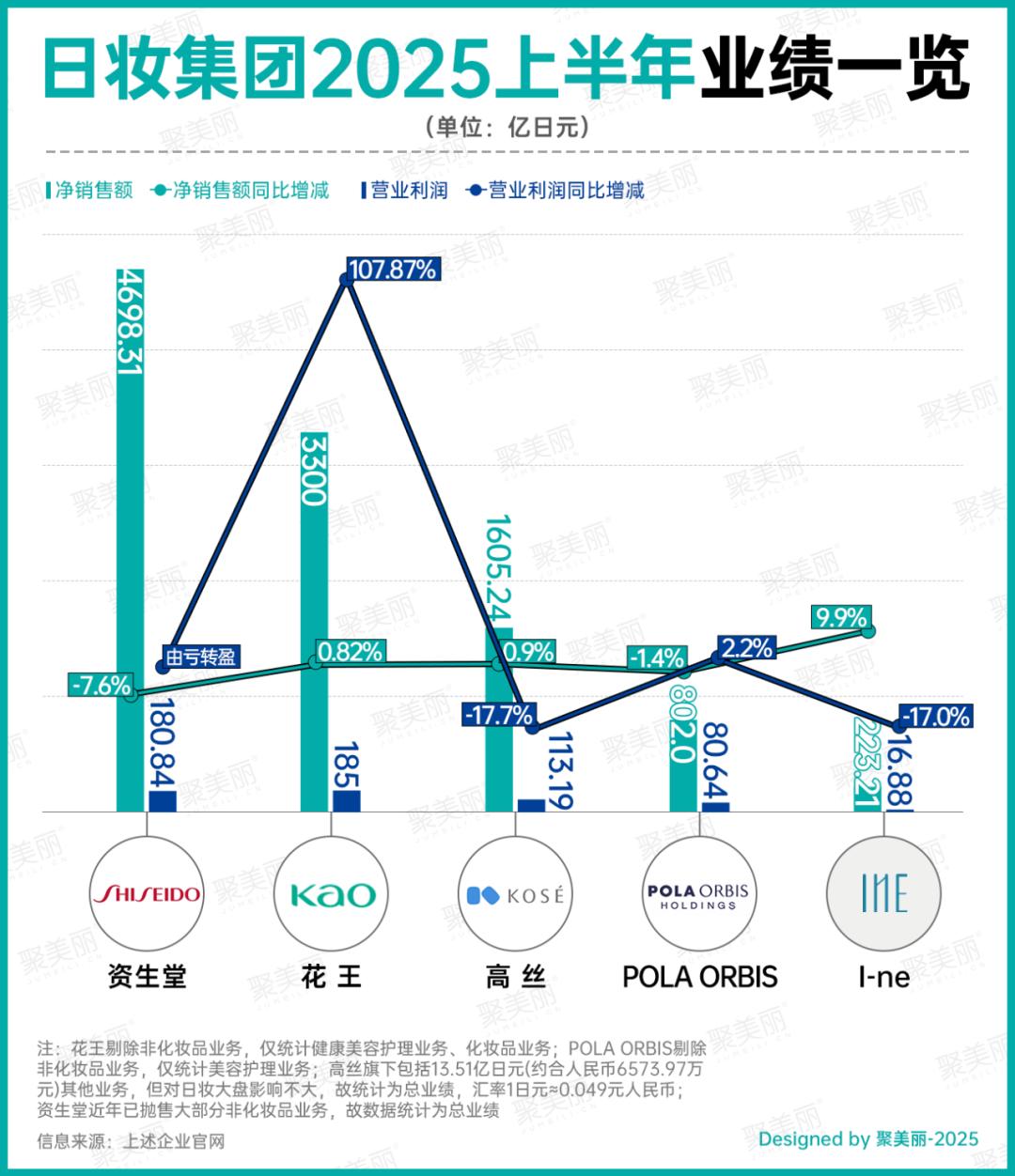 其實(shí),茱莉蔻及其母公司POLA ORBIS集團(tuán)當(dāng)前的處境只是日妝發(fā)展受阻的一個(gè)縮影。此前聚美麗曾在《暴跌、全線下滑?日妝巨頭們敗了!》一文中,分析了2025上半年日妝集團(tuán)的相關(guān)業(yè)績(jī)。