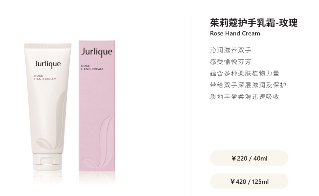 據(jù)茱莉蔻官網(wǎng)顯示,其產(chǎn)品線涵蓋護(hù)手霜、身體乳、精華水等,品牌定位圍繞“高端活機(jī)天然護(hù)膚”為核心,屬于國(guó)際中高端護(hù)膚品牌,價(jià)格區(qū)間顯著高于大眾護(hù)膚品牌。護(hù)手霜單價(jià)約200-400元,精華類產(chǎn)品多在500-1000元區(qū)間。
