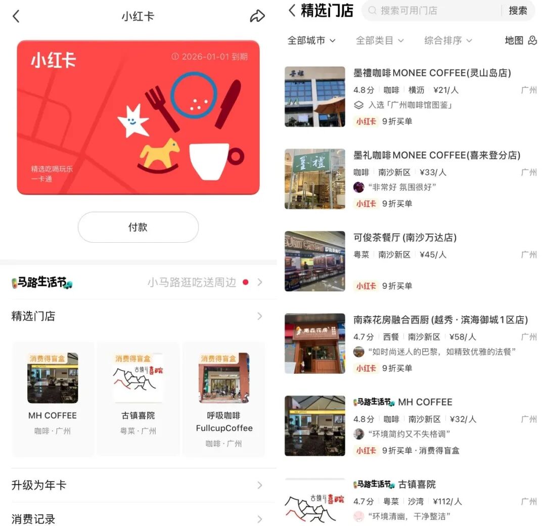 小紅卡是平臺基于AI等技術分析社區(qū)用戶的口碑評價后,給出的一份吃喝玩樂「精選」指南,也是一張168元年費的會員卡,購卡用戶可在開通「小紅卡」的門店消費享9折優(yōu)惠,同時享受門店隨機給予的盲盒等附加福利。