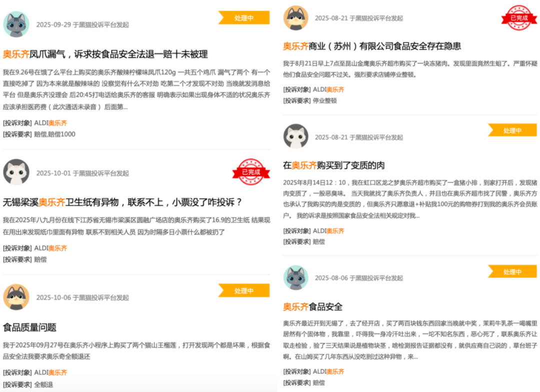 據公開投訴信息顯示,2025年7月以來,有消費者反映購買的食品中出現(xiàn)異物、水果腐爛等問題,部分消費者稱維權時曾遭遇門店工作人員對《食品安全法》相關條款的質疑;據黑貓投訴平臺公開信息顯示,截至2025年10月10日,奧樂齊相關投訴已達221條,其中超40%發(fā)生在2025年,蘇州、無錫的新店也卷入爭議。