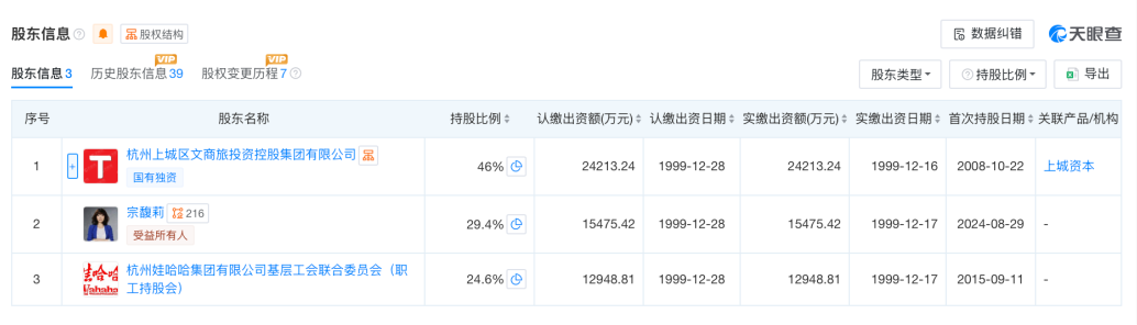 不過,娃哈哈集團的董事會成員未發(fā)生變更,宗馥莉仍為董事會主席及總經(jīng)理。同時,宗馥莉仍為杭州娃哈哈集團法定代表人,娃哈哈集團由上城文旅、宗馥莉、杭州娃哈哈集團有限公司基層工會聯(lián)合委員會(職工持股會)共同持股,其中上城文旅、宗馥莉分別持股46%、29.4%,宗馥莉為第二大股東。