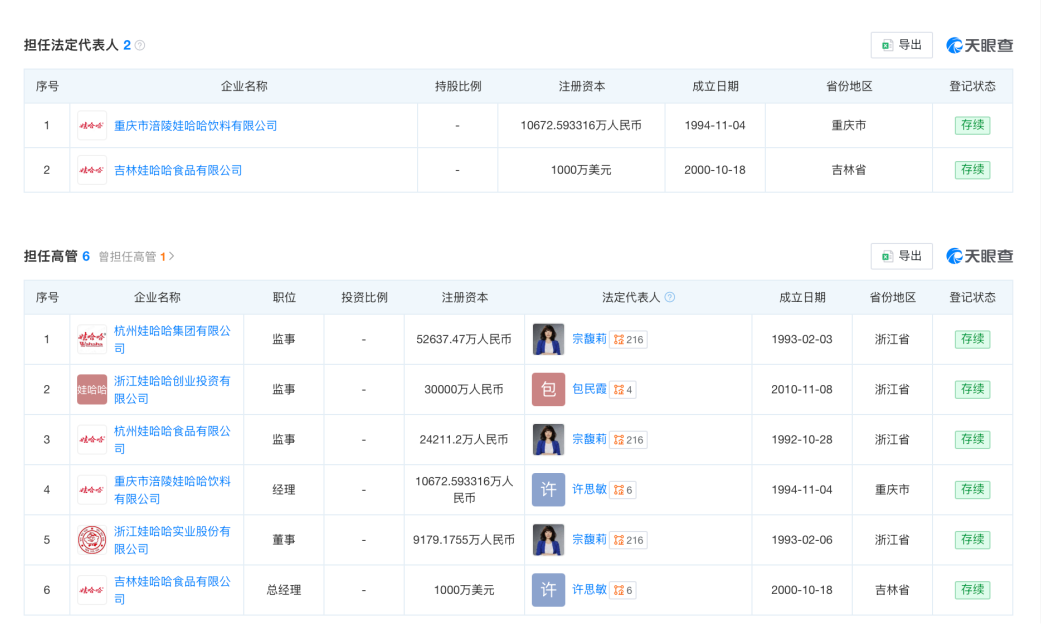 企天眼查顯示,許思敏目前擔任杭州娃哈哈集團、浙江娃哈哈創(chuàng)業(yè)投資有限公司、杭州娃哈哈食品有限公司等企業(yè)的監(jiān)事;重慶市涪陵娃哈哈飲料有限公司經(jīng)理;浙江娃哈哈實業(yè)股份有限公司董事;吉林娃哈哈食品有限公司法定總經(jīng)理等。