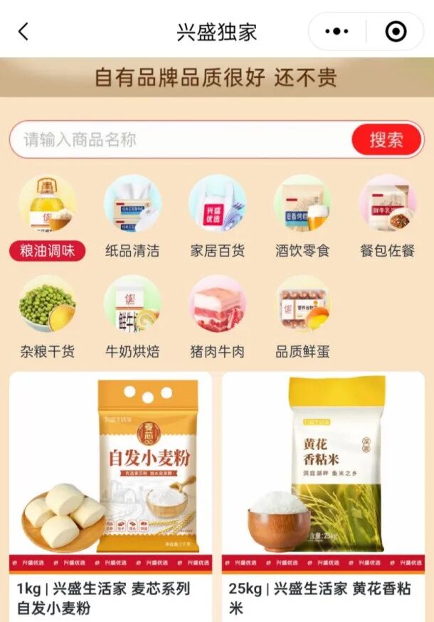 不僅是在團長端,興盛優(yōu)選也逐漸在商品環(huán)節(jié)積累起自有體系,比如目前興盛小程序內的“興盛獨家”專區(qū),其中均是標為“興盛生活家”的自營商品,涵蓋糧油調味、肉禽蛋奶和雜糧干貨等多個品類,主要供應商均為湘鄂贛三省的本地廠家,在選品、定價也形成了一定的差異化。
