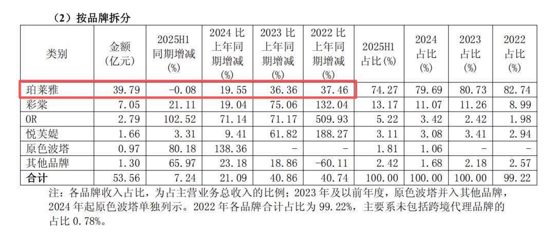 尤其是主品牌珀萊雅,增長(zhǎng)已經(jīng)停滯,上半年收入同比下滑0.08%。而2022年-2024年上半年,品牌的同期增速分別為37.46%、36.36%和19.55%。