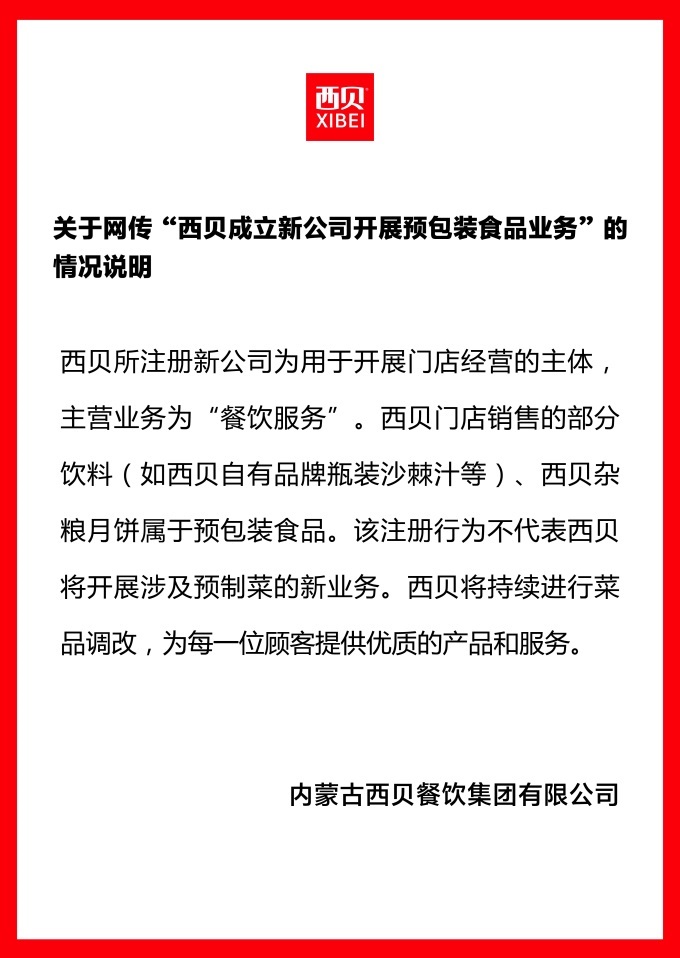 西貝在聲明中指出,所注冊(cè)新公司為用于開展門店經(jīng)營(yíng)的主體,主營(yíng)業(yè)務(wù)為“餐飲服務(wù)”。西貝門店銷售的部分飲料(如西貝自有品牌瓶裝沙棘汁等)、西貝雜糧月餅屬于預(yù)包裝食品。該注冊(cè)行為不代表西貝將開展涉及預(yù)制菜的新業(yè)務(wù)。