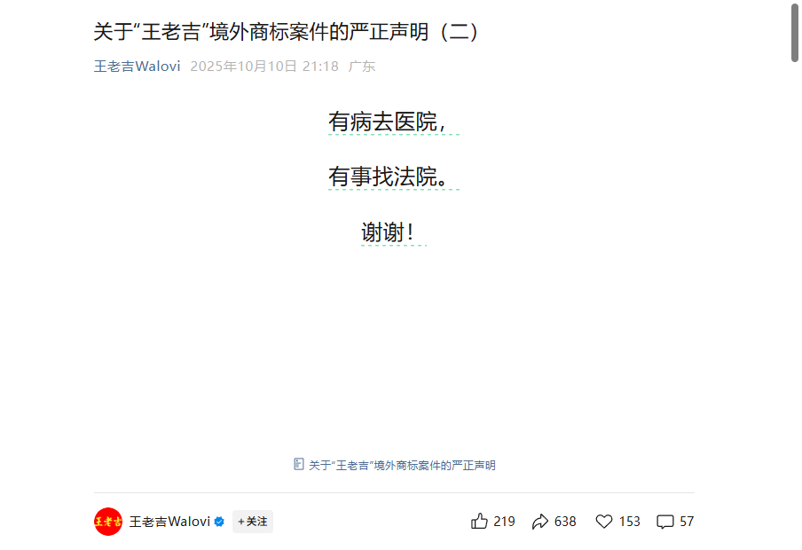 對(duì)此,王老吉于當(dāng)日晚間在其公眾號(hào)上僅以12字回應(yīng):“有病去醫(yī)院,有事找法院,謝謝!”