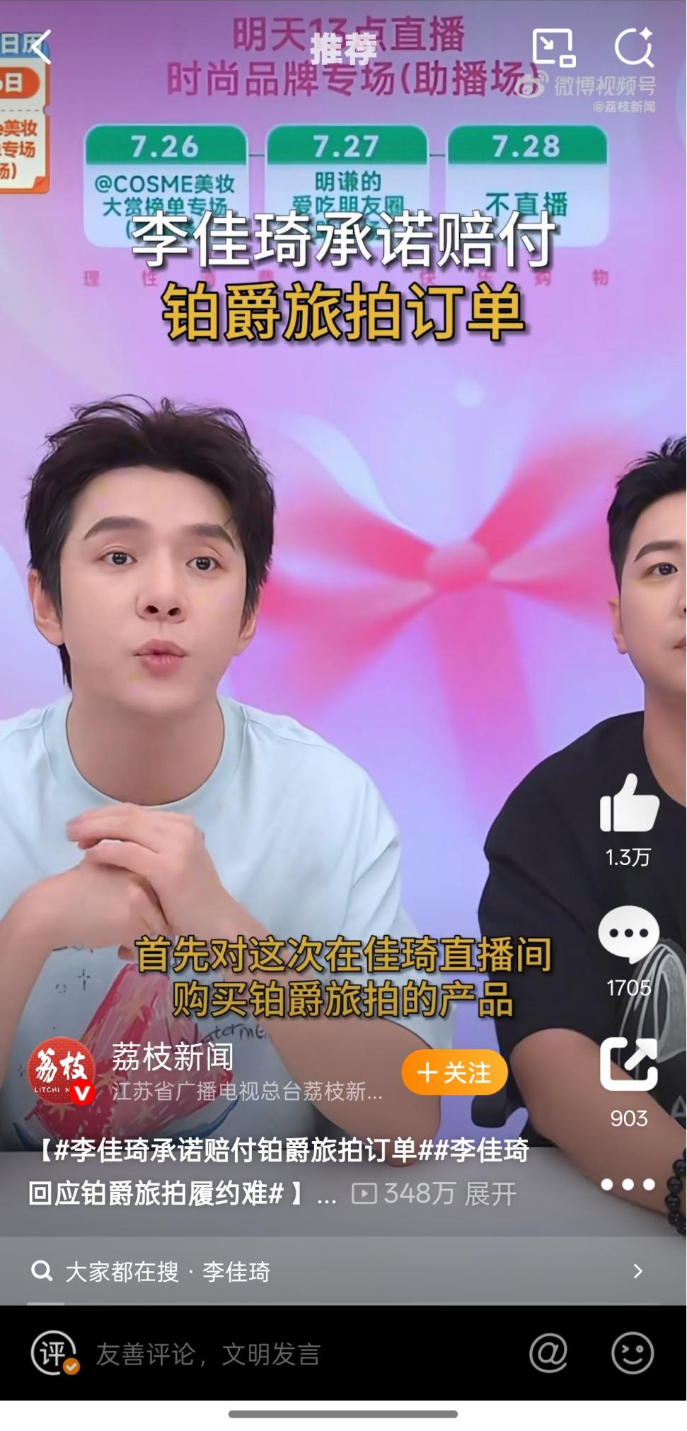例如,李佳琦直播間多次因商家無法履約而受到牽連。今年7月,有多位消費(fèi)者在社交平臺(tái)上表示,在鉑爵旅拍購買服務(wù)后遇到商品未交付、定金難退還等問題。而近幾年,鉑爵旅拍一直是李佳琦直播間的“?汀保写罅坑唵味紒碜岳罴宴辈ラg。因而,鉑爵旅拍事件也牽扯到了李佳琦直播間。后續(xù),李佳琦就合作商家鉑爵旅拍“跑路”事件,向消費(fèi)者道歉。此外,去年李佳琦直播間也因“童感”兒童攝影套餐無法兌現(xiàn)拍攝服務(wù)的事件,被推上了風(fēng)口浪尖。