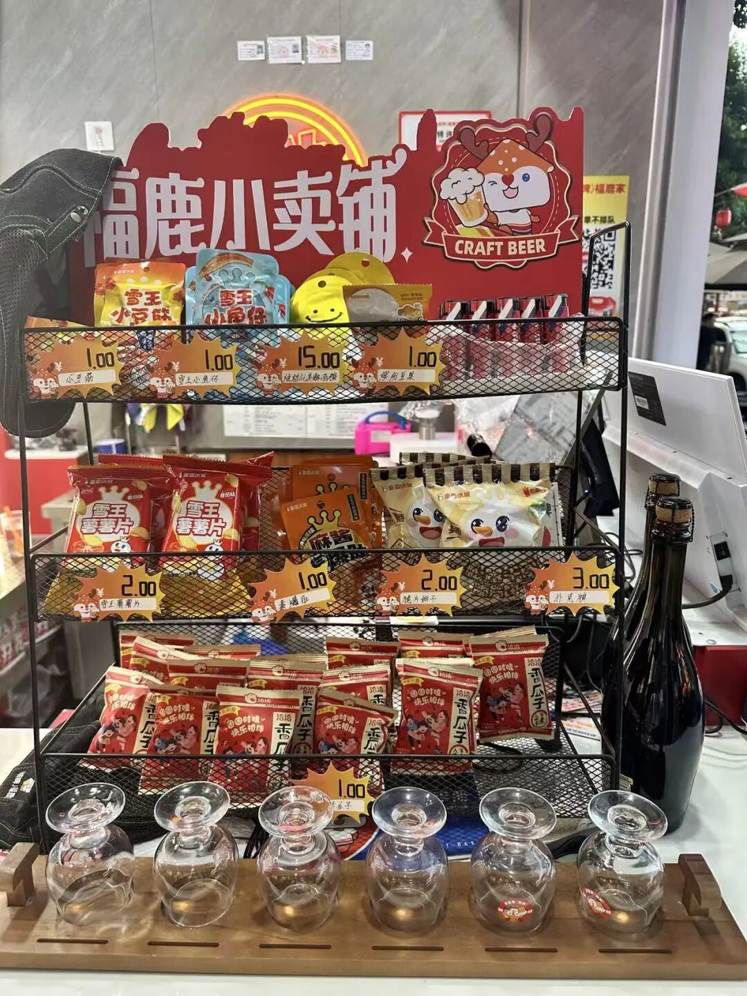 目前,該店鮮打啤酒SKU約16個(gè),包括提供了國(guó)標(biāo)鮮啤、茶啤、奶啤、果啤四大系列。此外,還有福鹿家罐裝啤酒,以及解酒糖、撲克牌和“雪王小豆筋”“雪王薯片”“雪王小魚仔”、恰恰香瓜子等十余款小食,價(jià)格在1-15元之間。