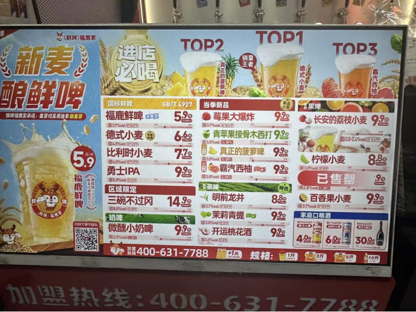 在定價(jià)模式上,鮮啤福鹿家和蜜雪冰城的價(jià)格帶也很相似,主打極致性價(jià)比。國(guó)標(biāo)鮮啤“福鹿鮮啤”為5.9元/斤(500ml),果啤、茶啤等風(fēng)味款多在6.9-9.9元之間。消費(fèi)者可按需選擇1斤、3斤、5斤甚至10斤的大容量規(guī)格,覆蓋單人小酌、多人團(tuán)建等消費(fèi)場(chǎng)景。