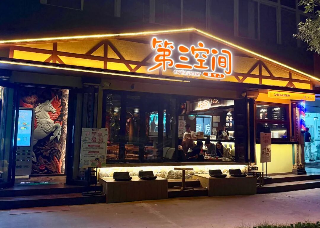 該店面積約20多平米,主打檔口自提及外賣,布局與奶茶店相似,前臺(tái)設(shè)有餐牌、收銀機(jī)和封口機(jī),店內(nèi)配備了兩套露營(yíng)桌椅。