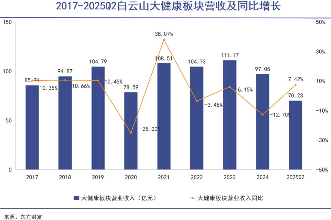 根據(jù)王老吉母公司白云山的歷年財報,以王老吉為主體的大健康板塊自從2019年之后,也陷入了營收動蕩。除去特殊年份的不利影響,去年大健康板塊營收97.05億元,在正常財年內(nèi)也出現(xiàn)了首次下滑。