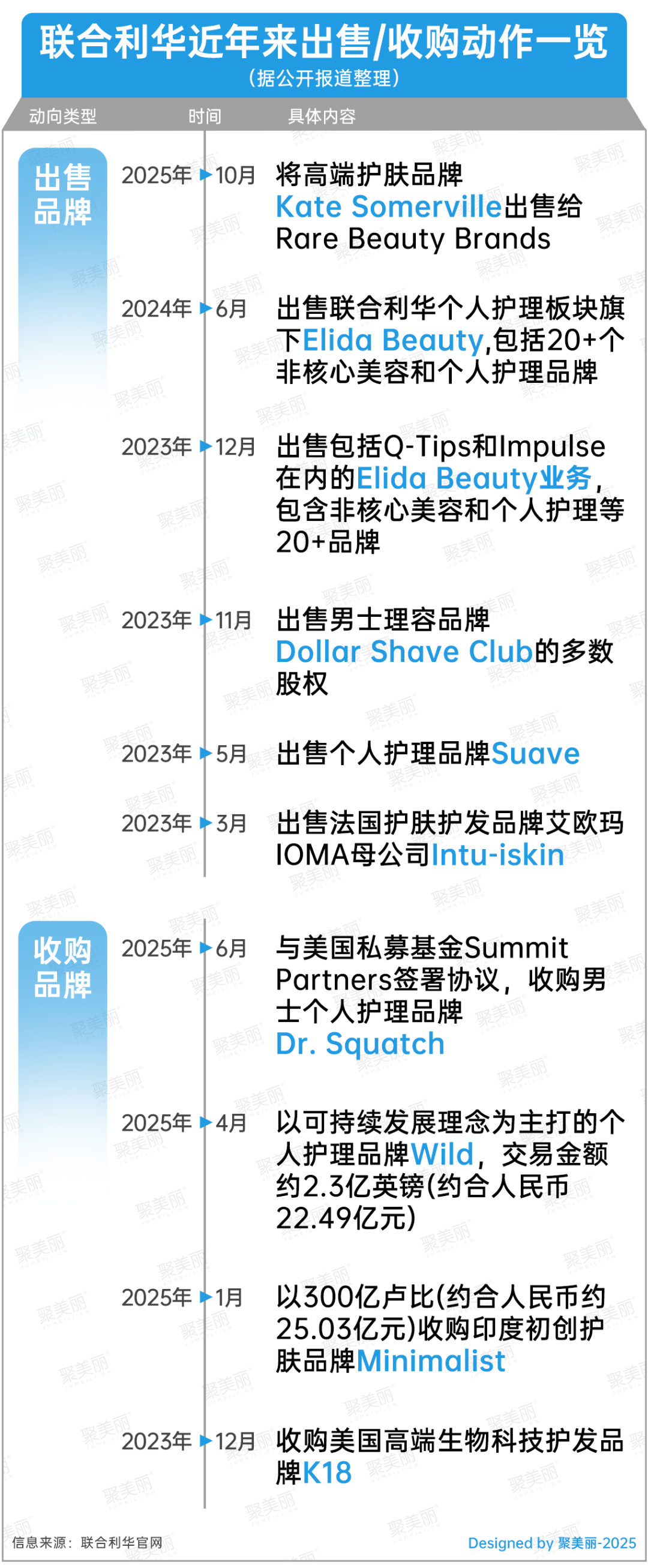 值得注意的是,凱詩薇并非聯(lián)合利華出售的首個(gè)非核心品牌。2023年以來,其已陸續(xù)出售包括Suave、Elida Beauty旗下20多個(gè)非核心品牌、Dollar Shave Club多數(shù)股權(quán)等。