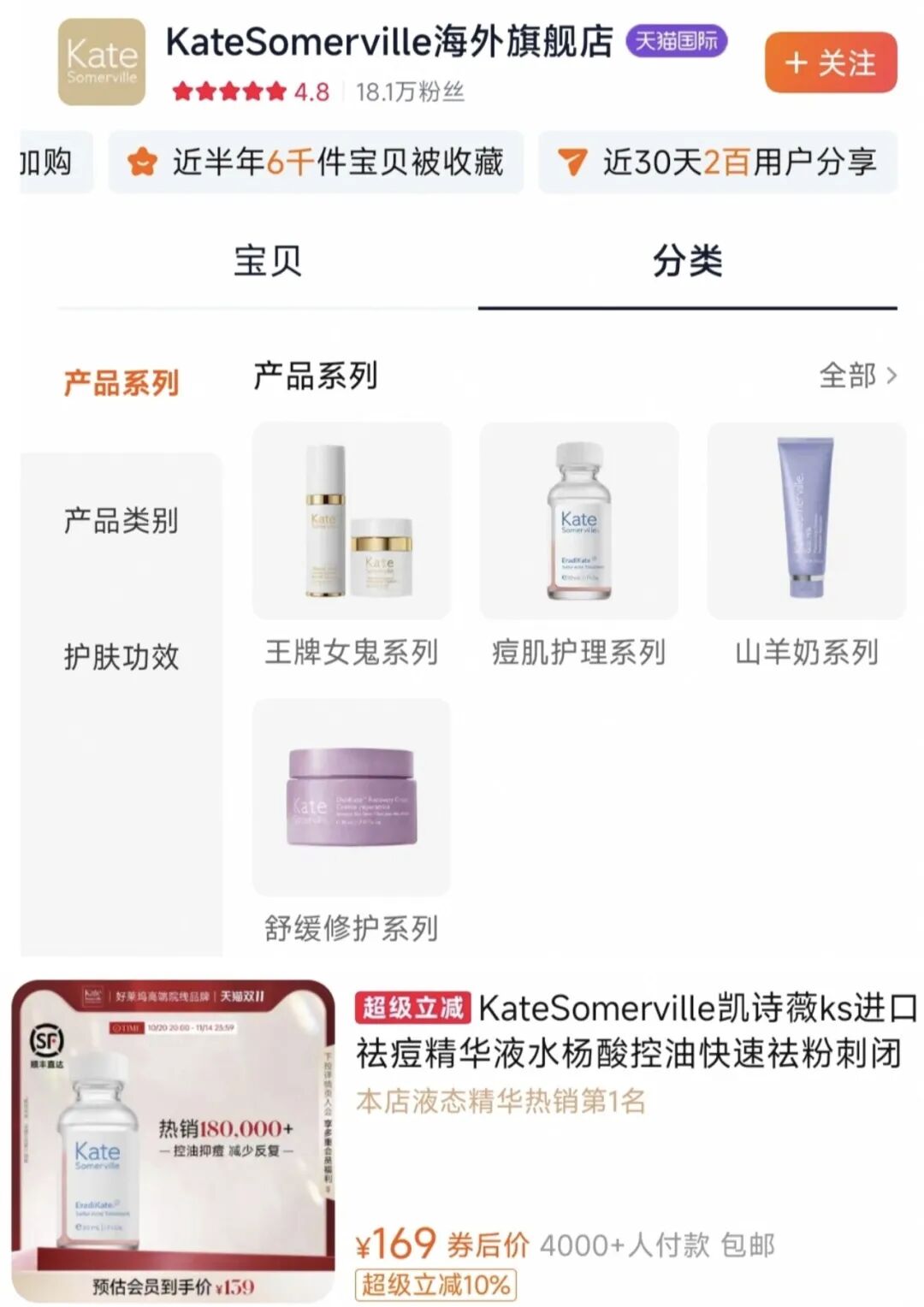 目前,凱詩薇已入駐全球范圍內(nèi)超2800家絲芙蘭門店,且在中國、韓國、新加坡、澳洲、新西蘭等國的高端商場內(nèi)設(shè)有專柜。而從線上店鋪來看,當(dāng)前凱詩薇天貓海外旗艦店共計(jì)6款產(chǎn)品在售,其中銷量最高的祛痘精華液僅4000+人付款。