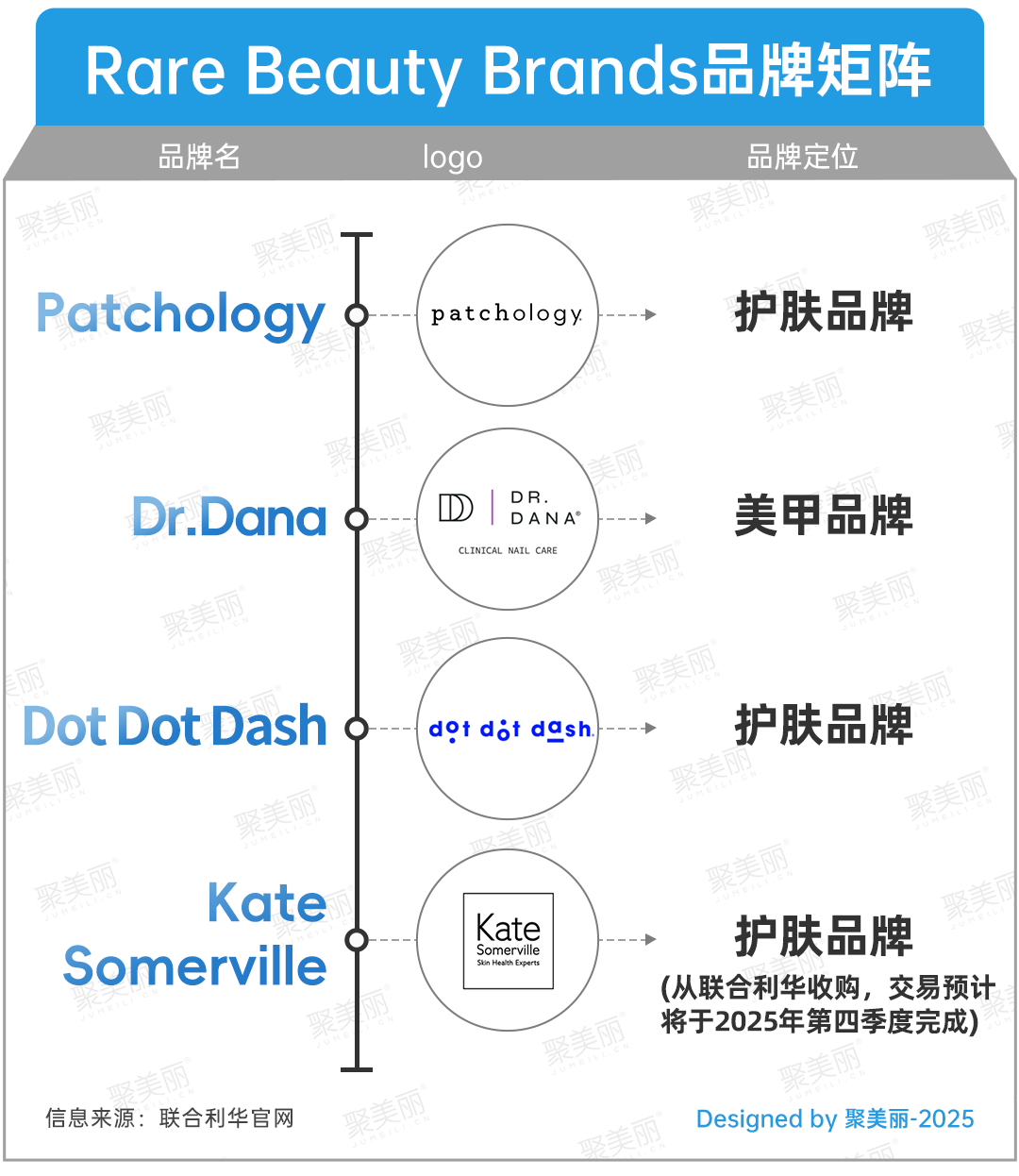 從聯(lián)合利華發(fā)布的公告來看,本次交易的買方為Rare Beauty Brands。據(jù)稱其是一家專注于獨(dú)立美容品牌收購與孵化的公司,旗下覆蓋美甲品牌Dr.Dana、護(hù)膚品牌Patchology、Dot Dot Dash等多個(gè)細(xì)分領(lǐng)域品牌。