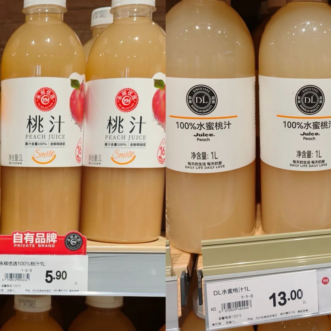 我們在店內(nèi)發(fā)現(xiàn),永輝優(yōu)選的一款100%桃汁,1L一瓶僅售價5.9元,而一旁的胖東來自營商品貨架上,1L一瓶的100%水蜜桃汁售價13元。還有貼標(biāo)YH Bakery的520g原味+伯爵紅茶瑞士卷,一盒8片售價19.9元,每片單價約2.5元;相比山姆的MM瑞士卷16片1.2kg售價59.8元,每片約3.7元。