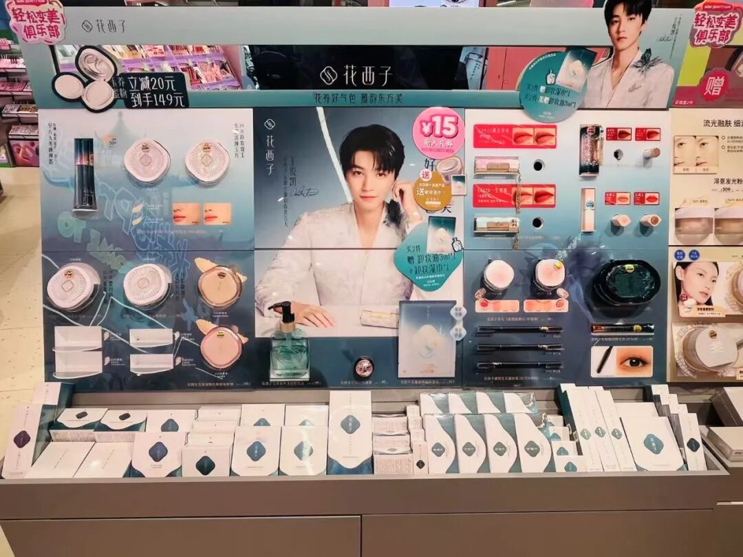 “玉養(yǎng)蜜粉立減20元,到手149元”,青眼走訪發(fā)現(xiàn),在武漢某wow colour門店,花西子展柜位于靠近門口處,買贈折扣活動標(biāo)簽、近期官宣的首位品牌全球彩妝代言人王俊凱海報十分醒目。