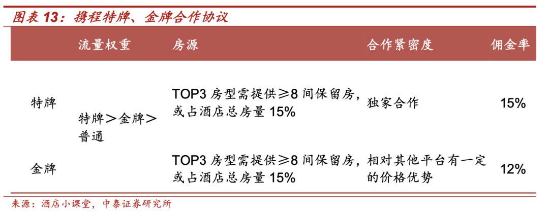 據(jù)中泰證券披露,攜程目前合作的酒店大概分為三種,分別是獨家合作的特牌、保障攜程平臺更低價的金牌,以及普通合作模式,其中,特牌和金牌的傭金率分別為15%、12%。