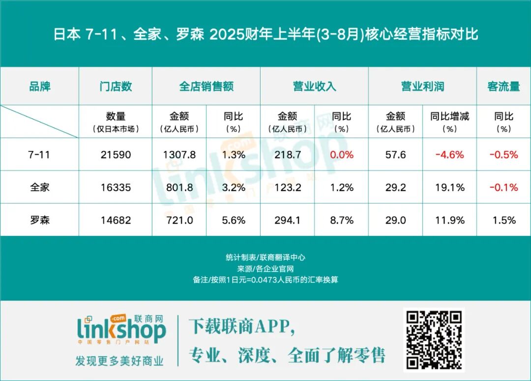 問題在于,作為集團(tuán)主心骨的日本7-11業(yè)務(wù)仍在“失速”。盡管客單價與同店銷售額保持增長,但客流量始終未能“止跌”。反觀競爭對手,羅森與全家展現(xiàn)出了更強(qiáng)的增長勢頭。它們不僅在同期實現(xiàn)了營業(yè)利潤的“雙位數(shù)”增長,單店日銷售額也同步升至約2.85萬元,進(jìn)一步縮小了與7-11(約3.3萬元)的差距。