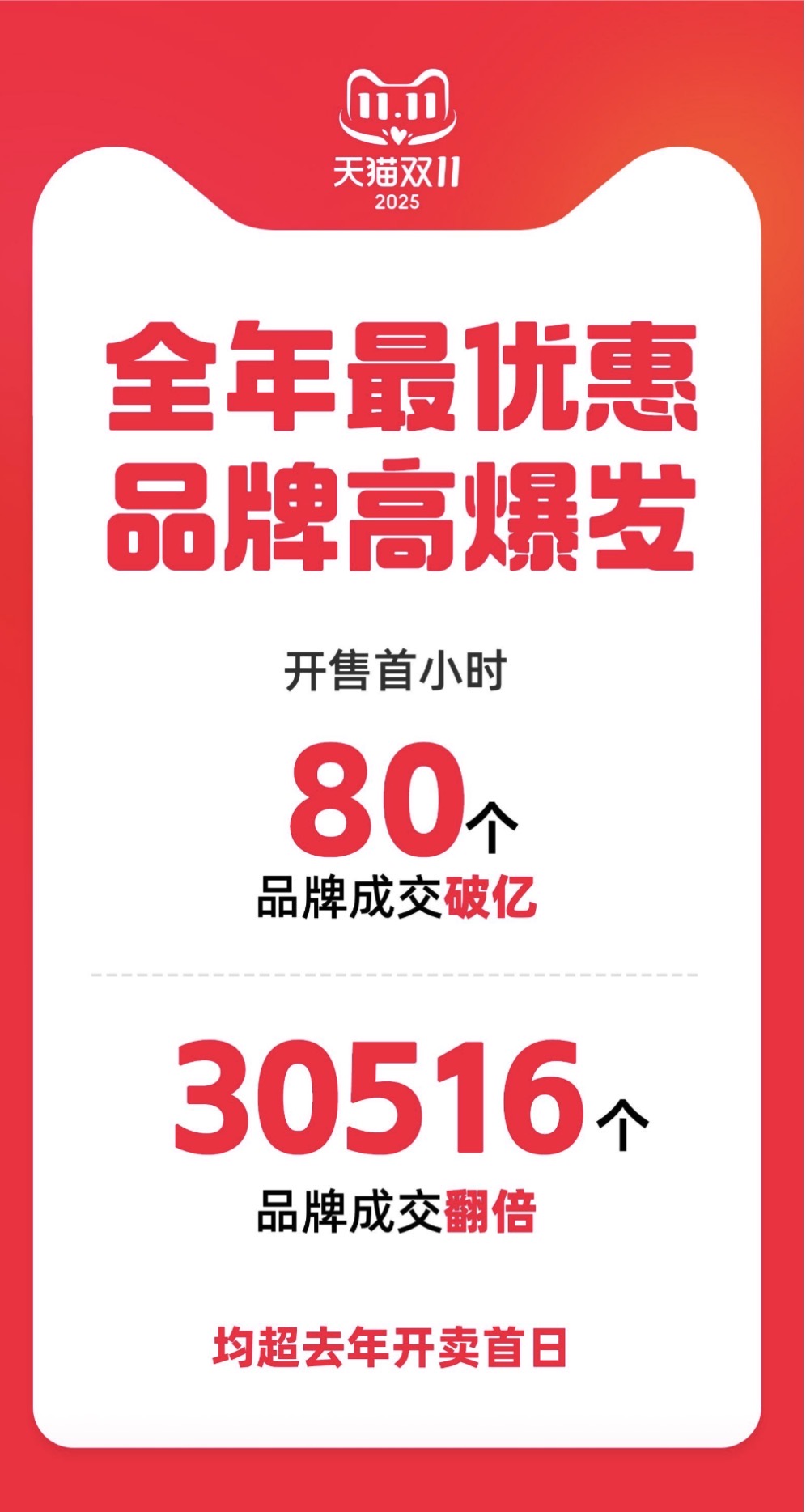 10月20日晚8點(diǎn),2025天貓雙11正式開(kāi)賣,品牌爆發(fā)速度更快,增長(zhǎng)更猛。開(kāi)賣首小時(shí),蘋果、源氏木語(yǔ)、珀萊雅、修麗可、斐樂(lè)、雅詩(shī)蘭黛、蘭蔻、歐萊雅、海藍(lán)之謎、石頭、耐克、lululemon等80個(gè)品牌成交破億,30516個(gè)品牌成交翻倍,均超去年開(kāi)賣首日,18919個(gè)品牌首小時(shí)成交即超去年全天。