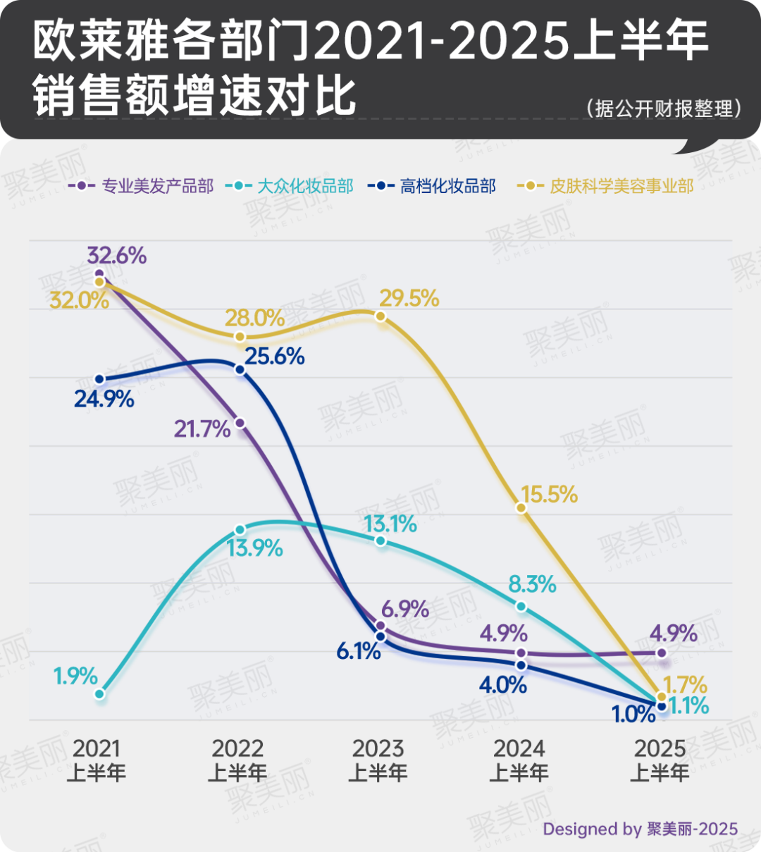 不過,歐萊雅集團此次重金投入,背后凸顯了其高檔化妝品部門增長面臨著顯著放緩的現(xiàn)實壓力。梳理近五年上半年歐萊雅集團各部門銷售額增速情況來看,其高檔化妝品部增幅自2022年上半年起連年走低,一路跌至今年上半年的1.0%,成歐萊雅集團增幅最低部門。