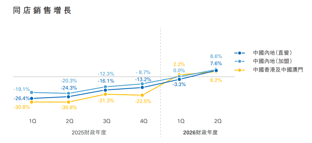 內地方面,直營店于季內的同店銷售轉為7.6%正增長,而加盟店的同店銷售則增長8.6%,若撇除鐘表業(yè)務,期內直營店的同店銷售增長9.9%。
