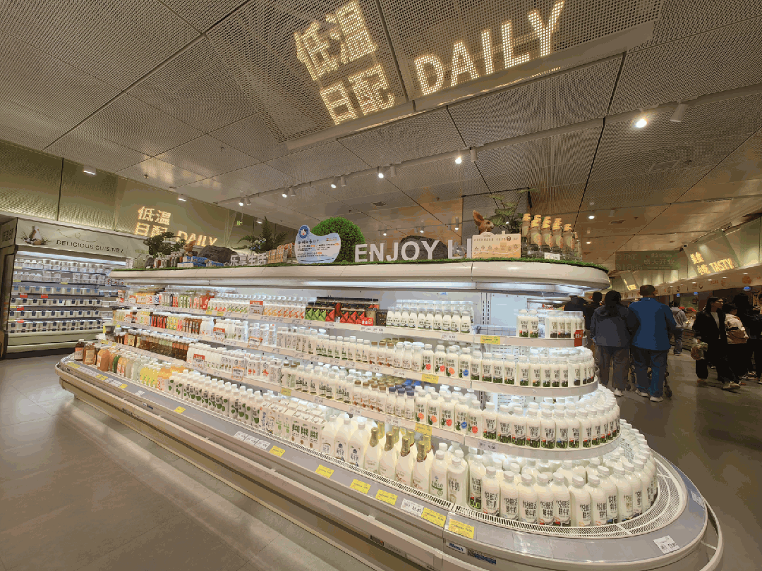 低溫日配區(qū)域位于入口左手邊。區(qū)域主次商品搭配合理,品項精簡高效,貨架明亮照明融合商品的配置,使顧客一入賣場就有強烈的購買欲望。