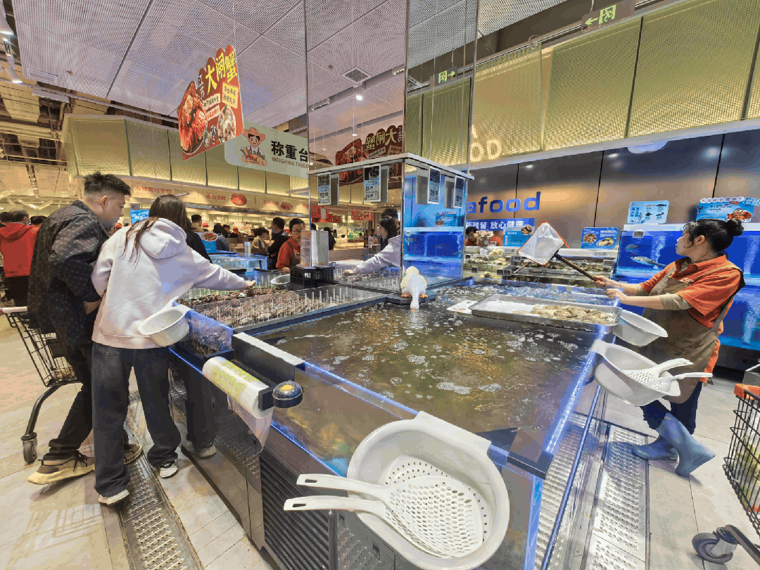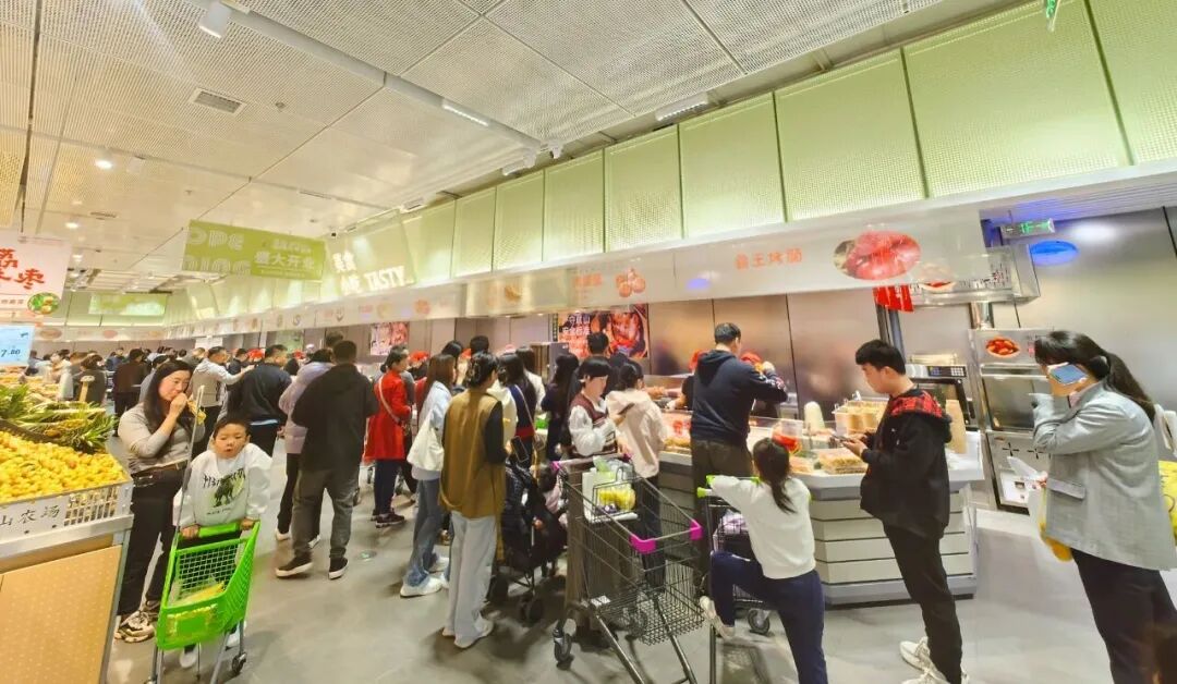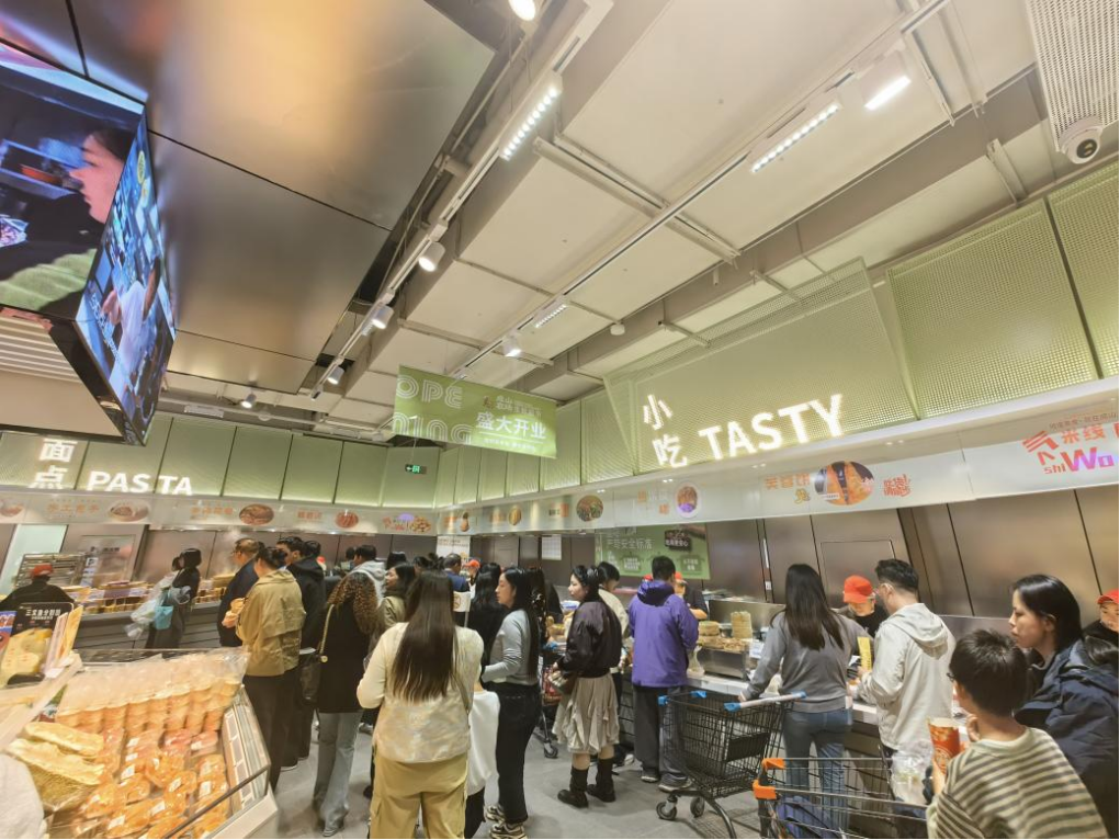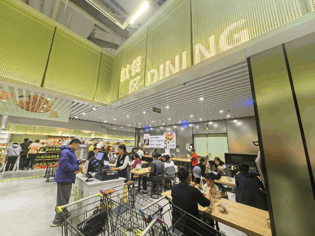 門店以“餐超結(jié)合”的模式,設置大面積餐飲區(qū),明廚亮灶,所有美食現(xiàn)場制作,讓顧客可清晰地看到食材品質(zhì)與制作全過程,為居民打造“購物+用餐”的一站式服務場景。