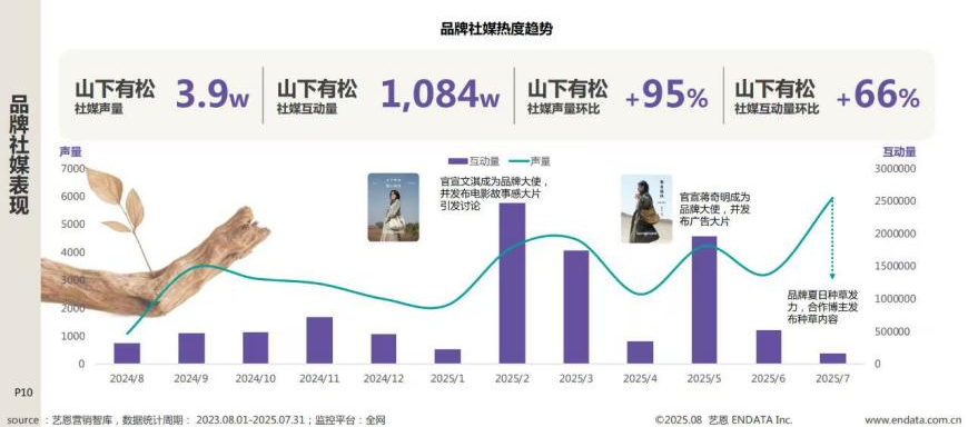 藝恩數據顯示,2025年山下有松的社媒聲量通過代言故事和短片實現了破圈式發(fā)展,同時,山下有松的社媒投放金額也同比增長28%