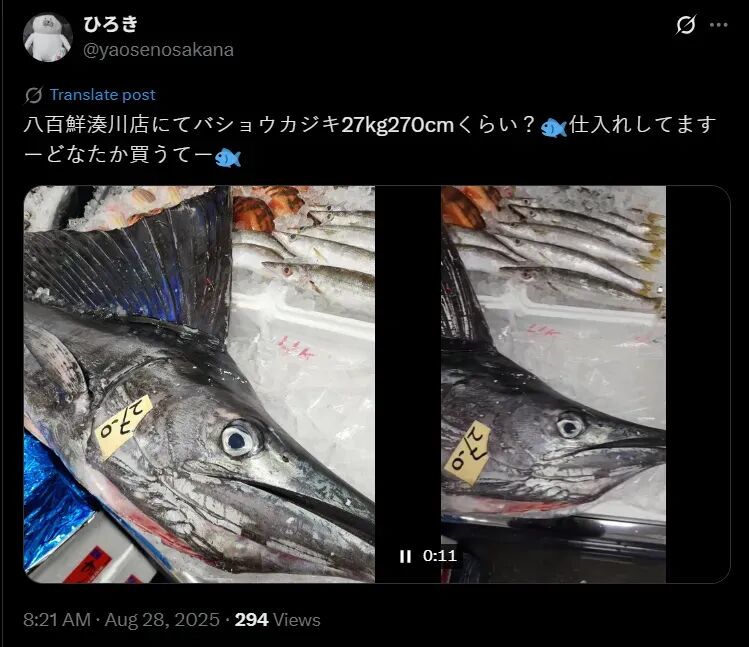 大意:八百鮮湊川店購入了一條旗魚,大概27公斤、270厘米左右哦,有沒有人來買呀