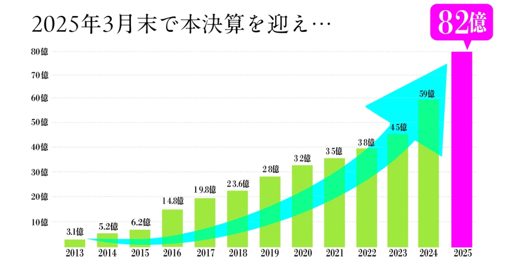 高人氣讓八百鮮的坪效率遠(yuǎn)超同行。據(jù)八百鮮分享,八百鮮的每坪年均銷售額達(dá)到1400萬日元(約合人民幣65.41元),這一數(shù)據(jù)是普通超市的3.5倍,是便利店的9.3倍。[1]即便2010年創(chuàng)立以來八百鮮只開出10家門店,截至2025年3月的財(cái)年,八百鮮仍創(chuàng)造82億日元(約合人民幣3.83億元)的銷售額,并已連續(xù)12年增長。