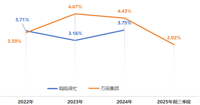 2024年,萬辰集團的存貨周轉天數為17.93天,鳴鳴很忙僅為?11.6天。今年三季度,萬辰的存貨周轉天數進一步上升至18.99。這似乎意味著,萬辰集團的企業(yè)運營效率、管理效率要弱于鳴鳴很忙。