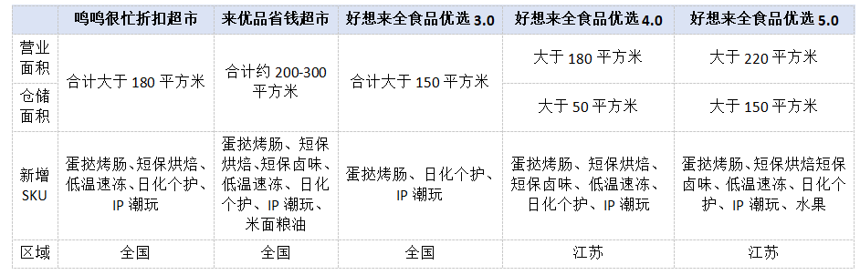另一邊的鳴鳴很忙,也在今年2月推出了兩大自有品牌系列產品——主打質價比的紅標、與高質量的金標。不久前,鳴鳴很忙還推出了3.0店型,新增了日化、文具、鮮食等多品類,致力于打造“一站式的硬折扣超市”。