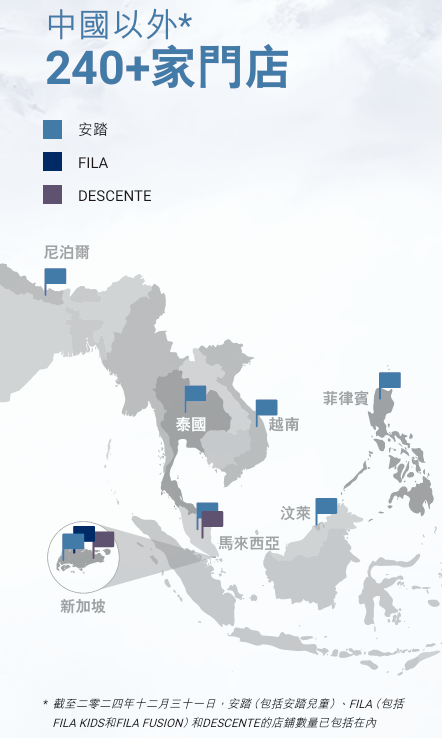 2024年,安踏體育在中國以外的門店(主要為安踏、FILA以及迪桑特門店)有超240家;截至今年上半年,安踏體育海外門店總數約為250家。
