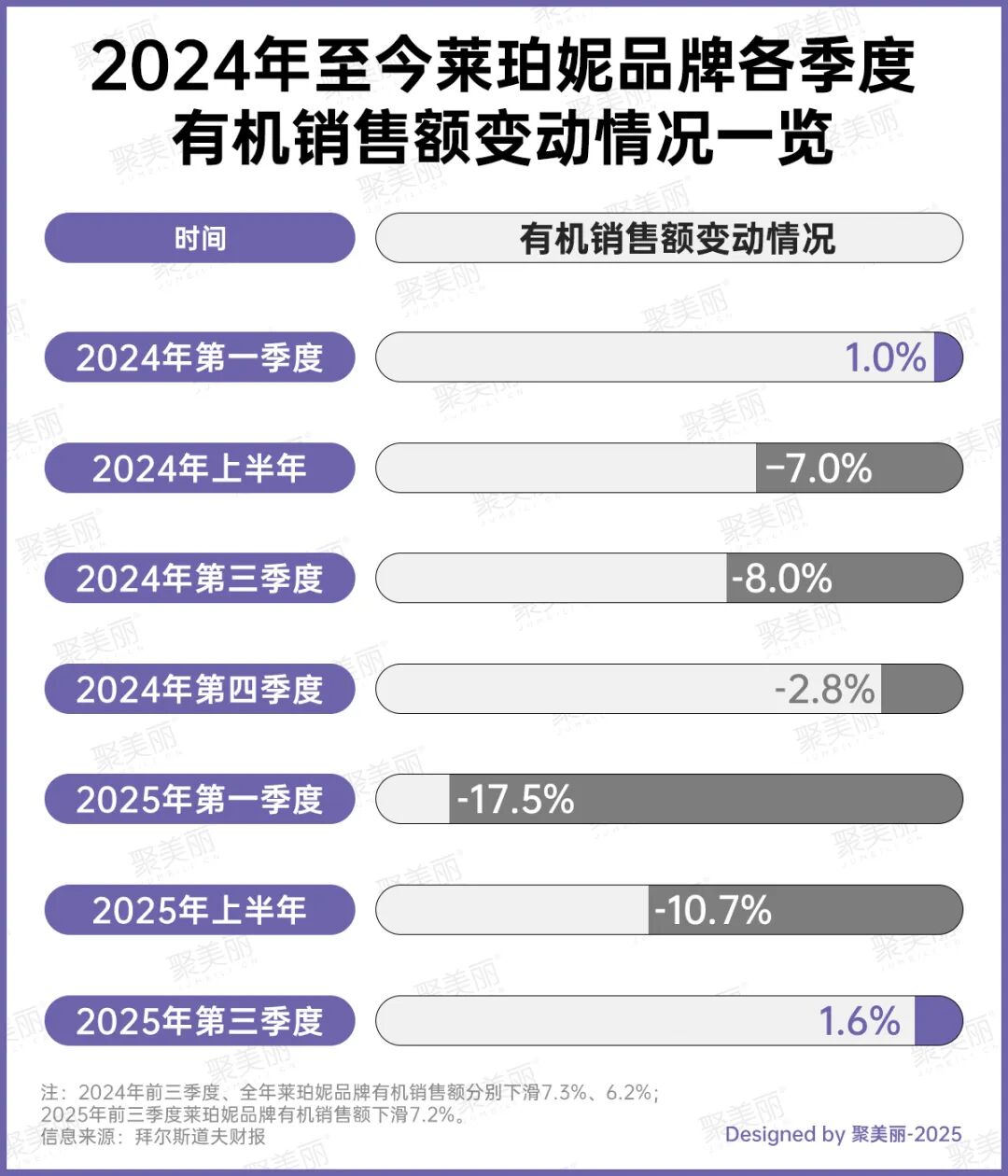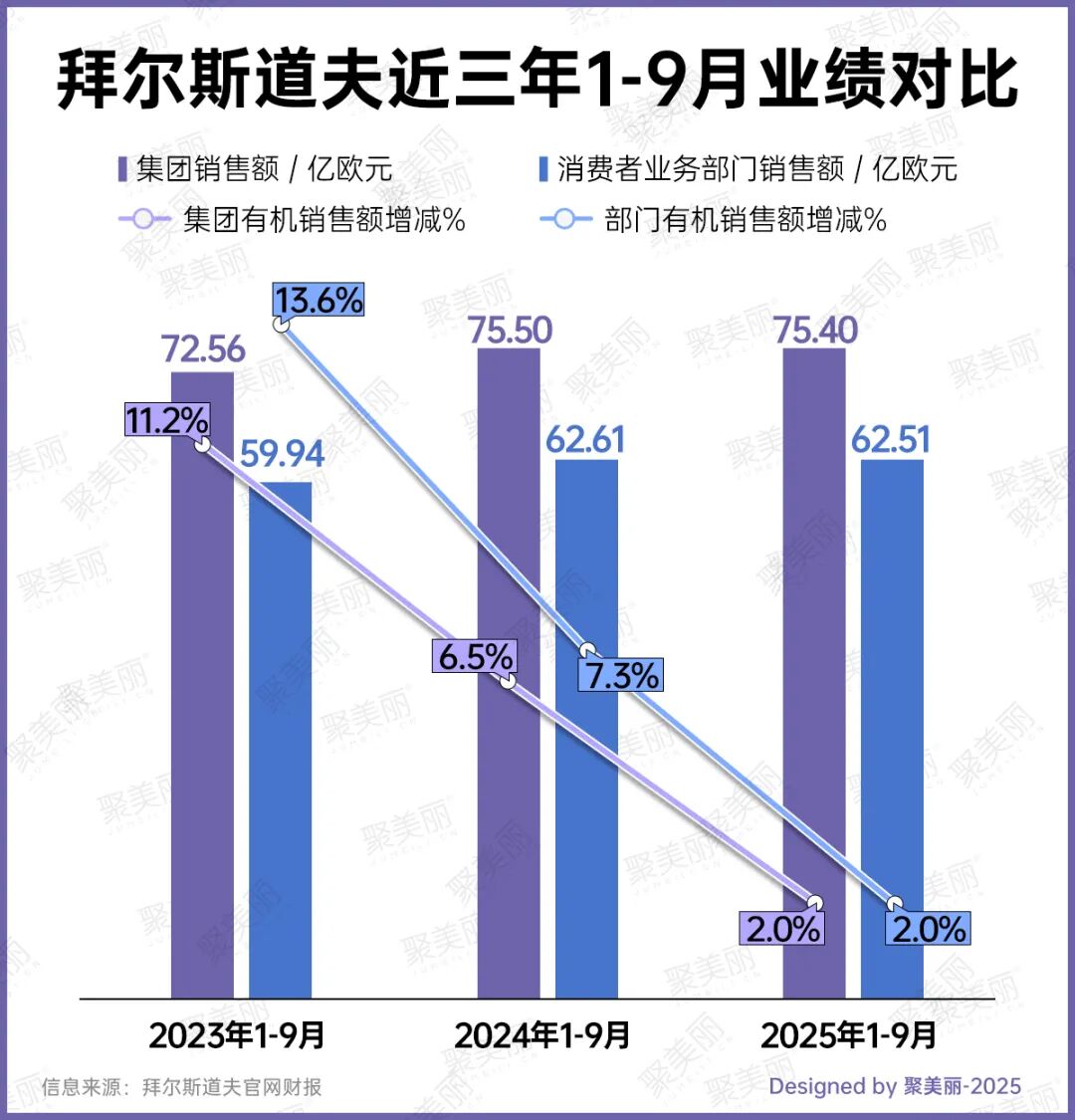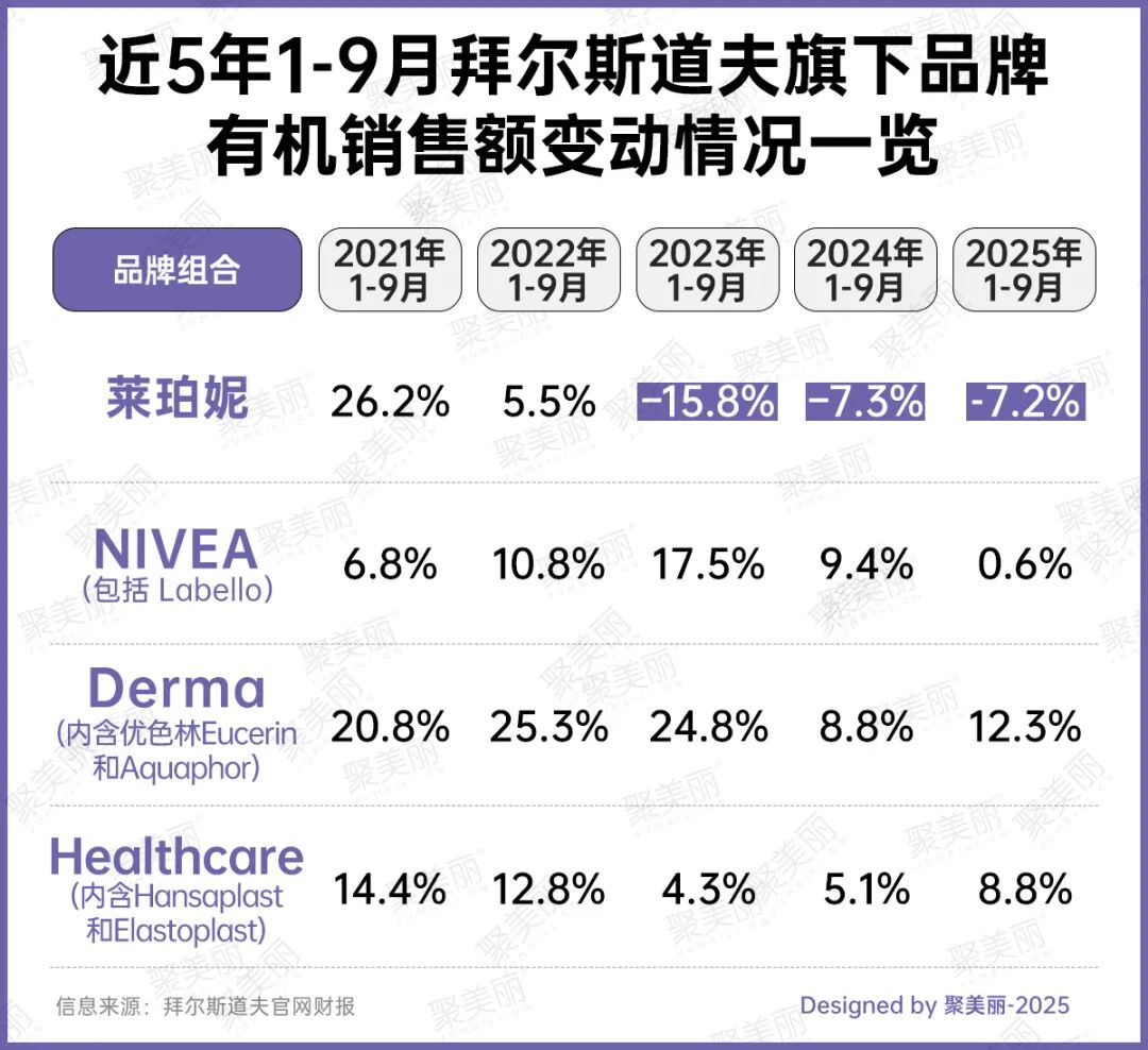 10月23日,萊珀妮母公司拜爾斯道夫發(fā)布了2025年三季報(bào),在2025年前9個(gè)月的銷售表現(xiàn)中,萊珀妮下滑7.2%,在今年Q1和上半年該品牌銷售額也均呈下滑態(tài)勢(shì)。