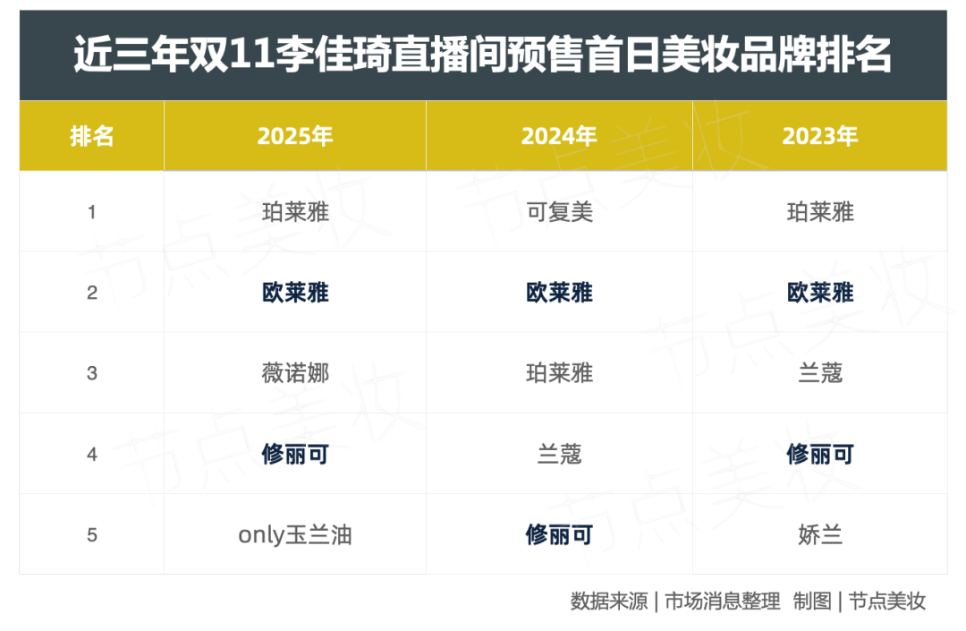 渠道方面,歐萊雅在近三年雙11期間穩(wěn)定保持在李佳琦直播間熱門品牌前列,旗下修麗可等高端品牌也持續(xù)受到市場(chǎng)認(rèn)可,顯示出其在中國(guó)市場(chǎng)的渠道運(yùn)營(yíng)能力。