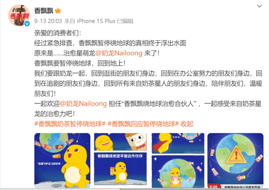 今年9月,香飄飄在其官方微博發(fā)布了一則“暫停繞地球”的緊急公告,但實際上,這并非品牌傳播遇到危機,而是一場精心策劃的預告。在眾多不解的聲音中,該品牌隨后正式宣布與熱門IP“奶龍”的合作,并表示“要暫停繞地球,回到地上!”
