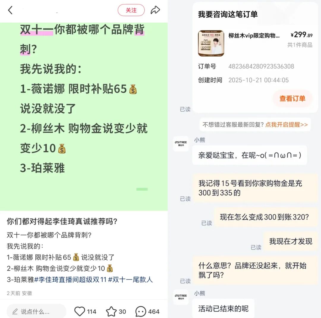 然而,在這些看似亮眼的數(shù)據(jù)背后,今年的雙11在社媒平臺(tái)上充斥著有關(guān)集體退款、品牌背刺、平臺(tái)規(guī)則模糊等各類現(xiàn)象的筆記。