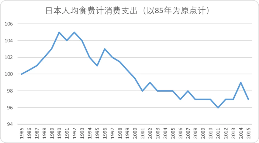 長期以來,受食材自給率低下、人工成本偏高的影響,日本餐飲消費(fèi)的價(jià)格相對(duì)較貴,外出就餐的成本自然也高。原本經(jīng)濟(jì)的繁榮讓居民普遍樂觀,他們不在意這部分支出,就連奢侈品消費(fèi)也空前膨脹。但自從進(jìn)入“失去的三十年”,日本的人均收入開始逐漸下滑,和所有消費(fèi)品一樣,餐飲客單價(jià)在泡沫破裂后也悄悄“縮水”。
