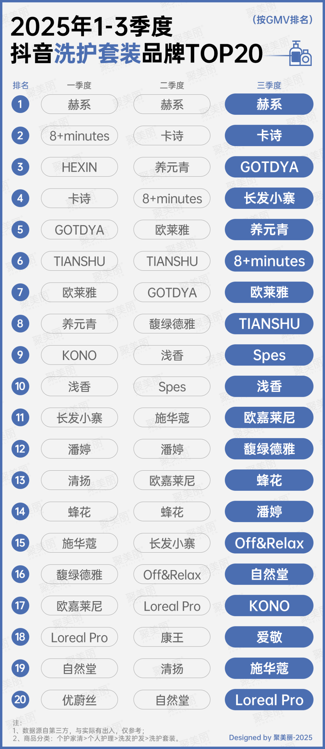 從細(xì)分領(lǐng)域來(lái)看,品牌格局的變化更為顯著,因爆品的打法赫系連續(xù)三個(gè)季度登頂洗護(hù)套裝榜單TOP1,而養(yǎng)元青、蜂花、施華蔻、自然堂等均有單季/多個(gè)季度在榜。
