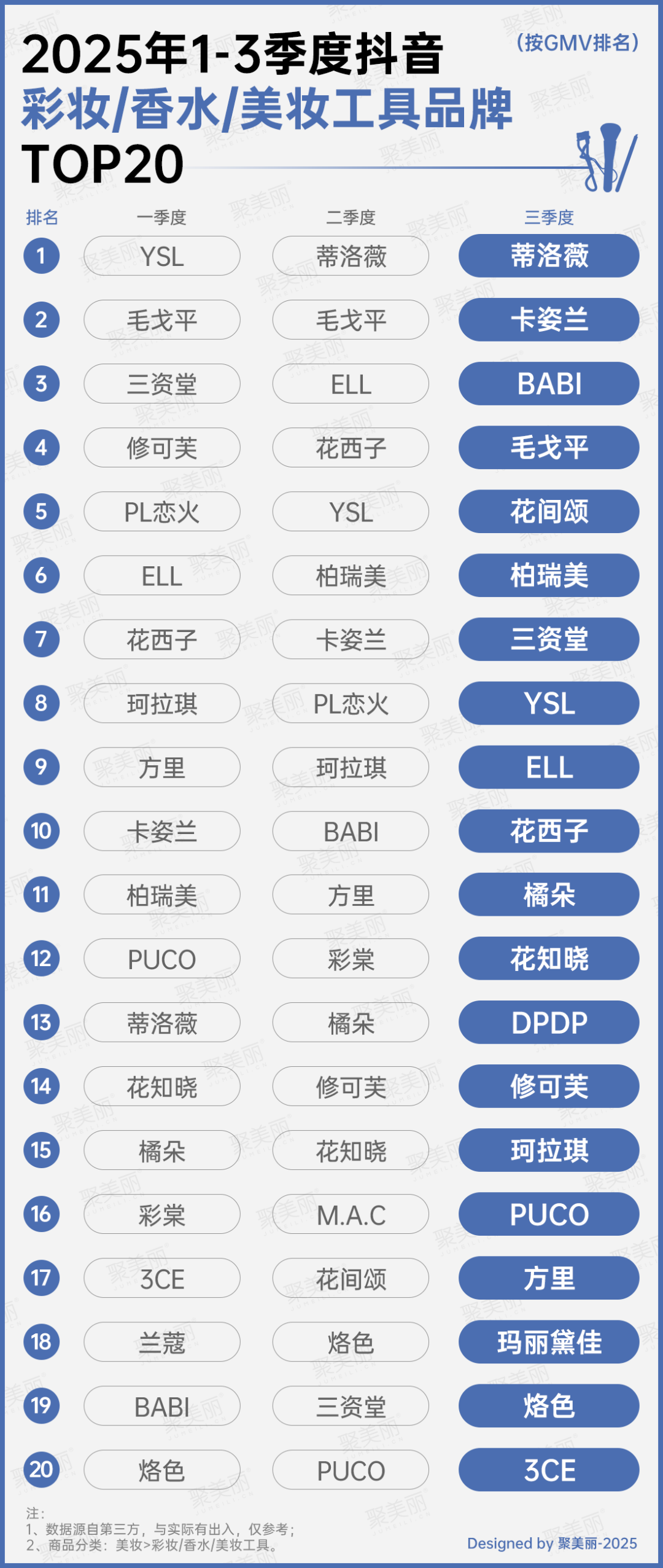 而彩妝/香水/美妝工具品牌TOP20榜相較而言,品牌格局相對(duì)穩(wěn)定。YSL在第一季度登頂TOP1,后續(xù)兩季度均為蒂洛薇霸榜。