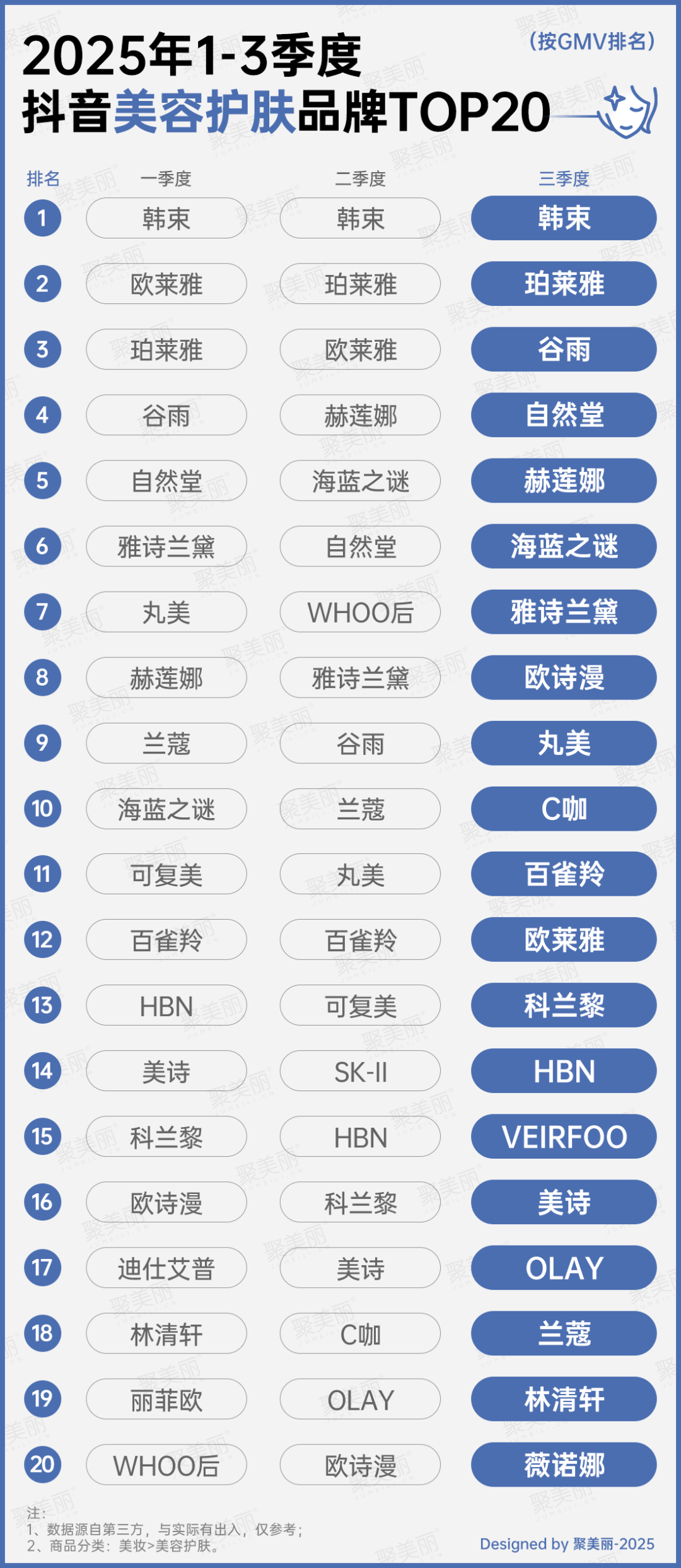 韓束蟬聯(lián)三季度榜首,珀萊雅在二、三季度穩(wěn)居亞軍。相較之下,一季度曾高居第二名的歐萊雅則大幅下滑,三季度跌至第12名。