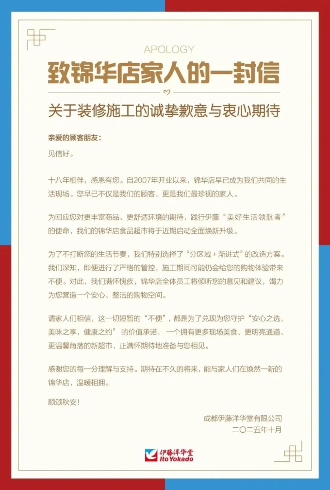 當成都伊藤洋華堂錦華店以一封飽含誠意的《致歉信》開啟 “分區(qū)域+漸進式”不閉店改造時,這個日系零售巨頭的自我革新之舉,恰好觸碰了零售業(yè)轉型調(diào)改的一個核心命題:在消費需求升級與經(jīng)營可持續(xù)性的雙重壓力下,不閉店改造究竟是兼顧各方利益的智慧選擇,還是暗藏風險的妥協(xié)之舉?