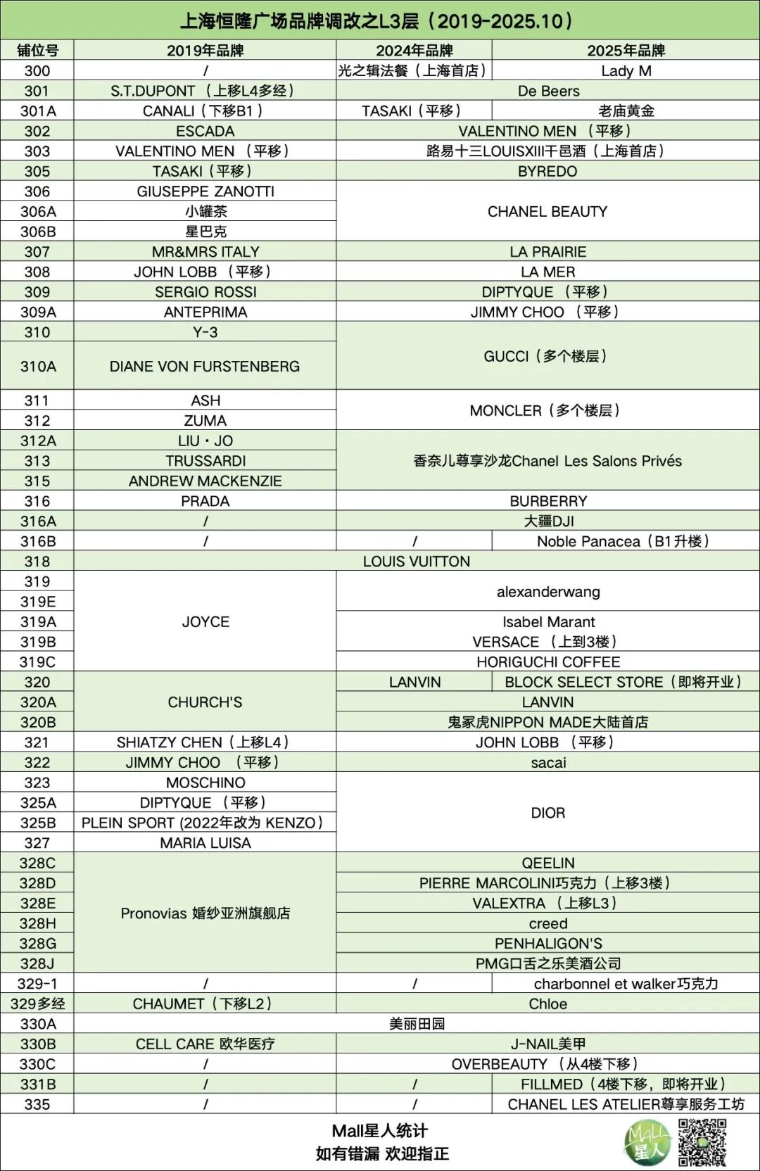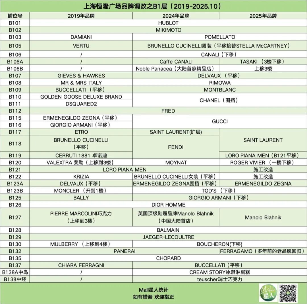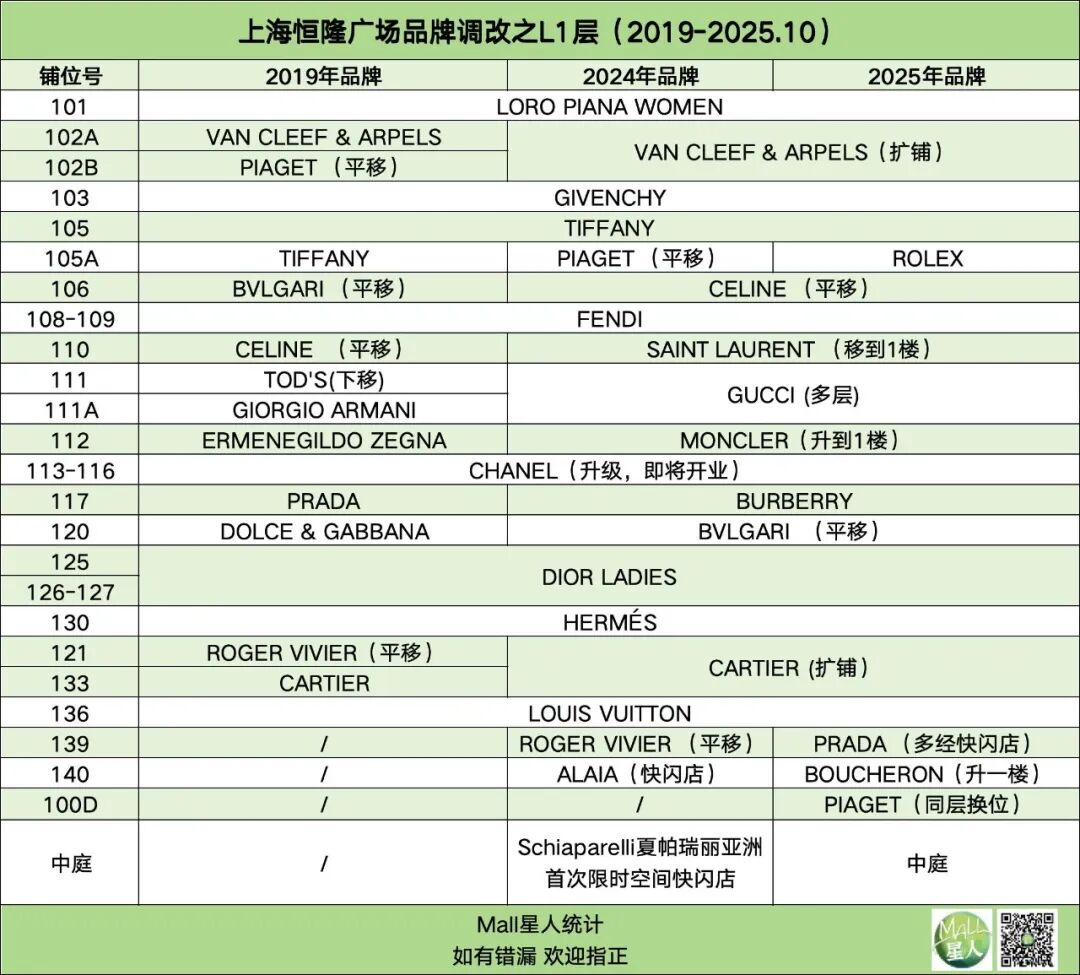 2020年,年滿20周歲的上海恒隆廣場(chǎng)開(kāi)始新一輪品牌升級(jí),故Mall星人選取2019年品牌表對(duì)比2025年,看下近6年每個(gè)鋪位的品牌變化,從中分析其最新的品牌迭代思路。