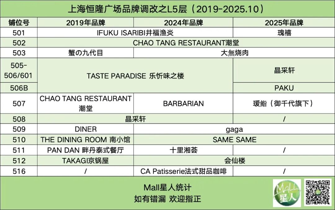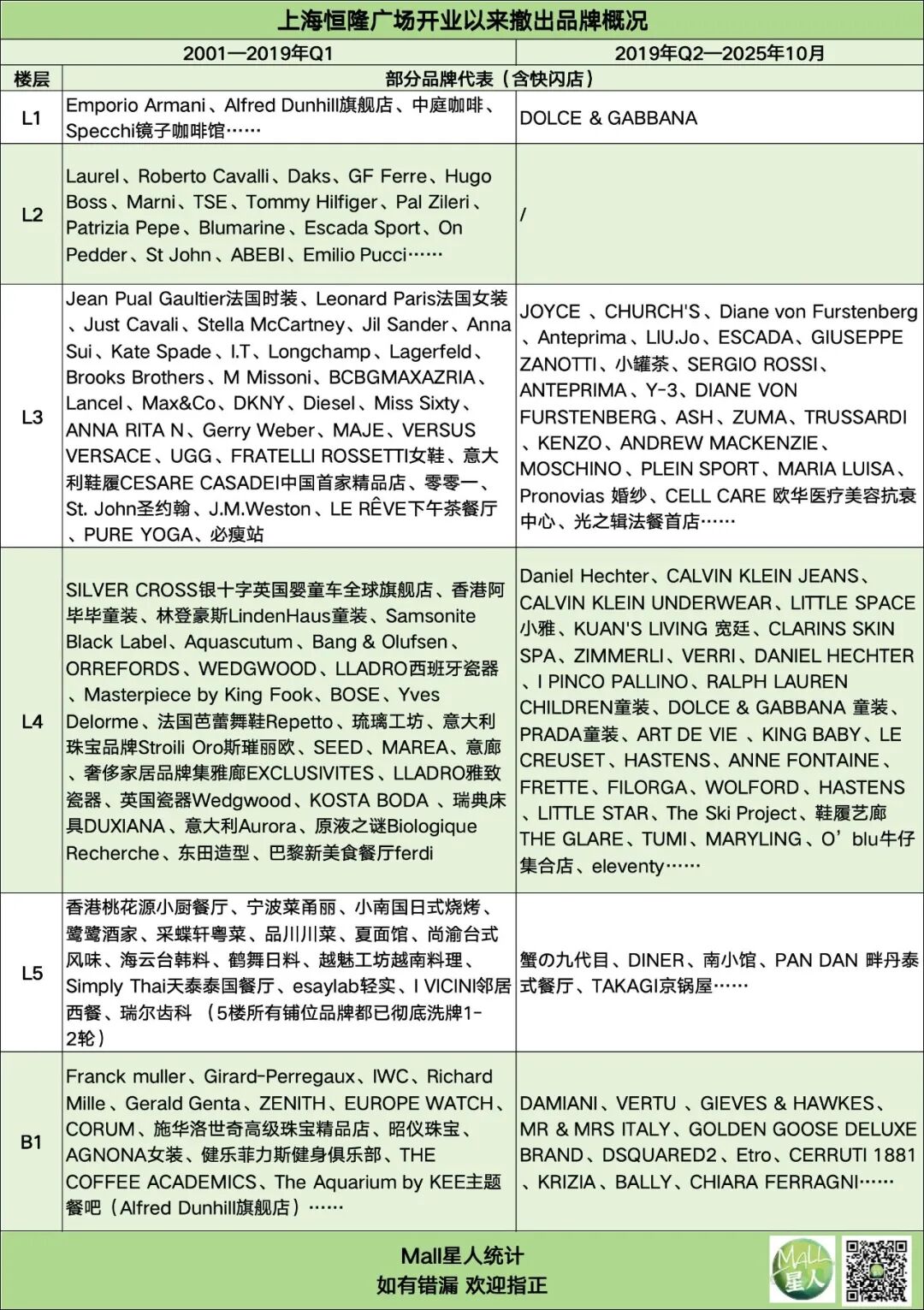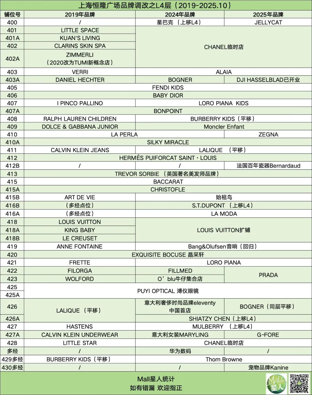 2020年,年滿20周歲的上海恒隆廣場(chǎng)開(kāi)始新一輪品牌升級(jí),故Mall星人選取2019年品牌表對(duì)比2025年,看下近6年每個(gè)鋪位的品牌變化,從中分析其最新的品牌迭代思路。
